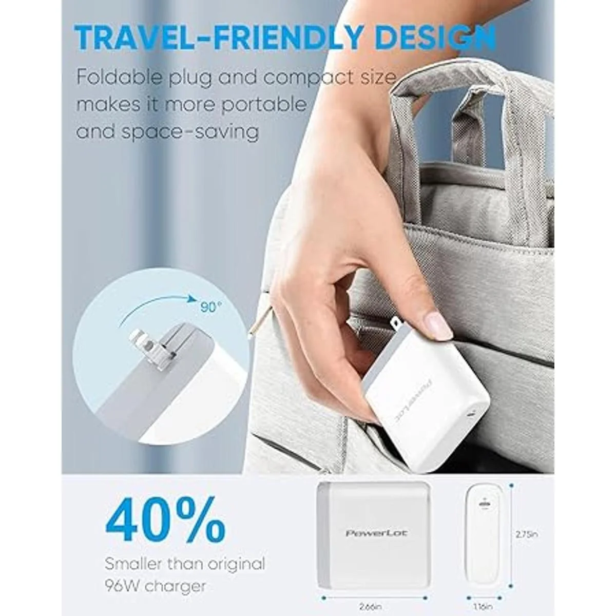 Tecnología avanzada GaN: con la última tecnología GaN, hasta un 96 de eficiencia de carga hace que este adaptador de corriente de pared de 100 W se cargue más rápido mientras genera menos calor. 40 más pequeño que el cargador original de MacBook Pro de 16 pulgadas y viene con un enchufe plegable, este bloque de cargador ocupará menos espacio en tu bolsillo o equipaje, fácil de llevar a cualquier lugar que vayas