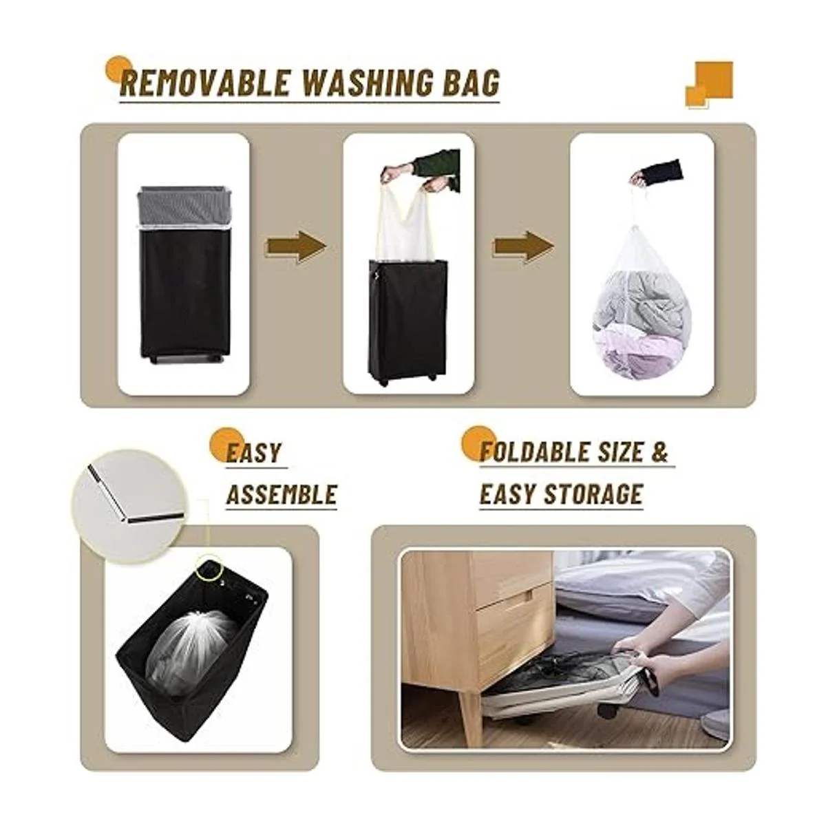 Resistente al agua: el organizador de cuarto de servicio está hecho de tela de alta densidad con material impermeable que asegura un uso duradero. El carrito de lavandería se puede limpiar fácilmente con un paño húmedo.