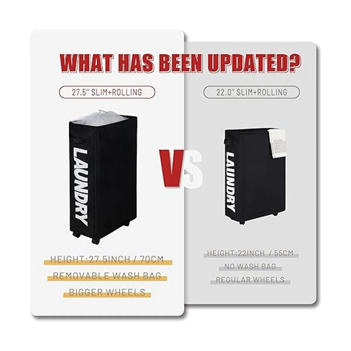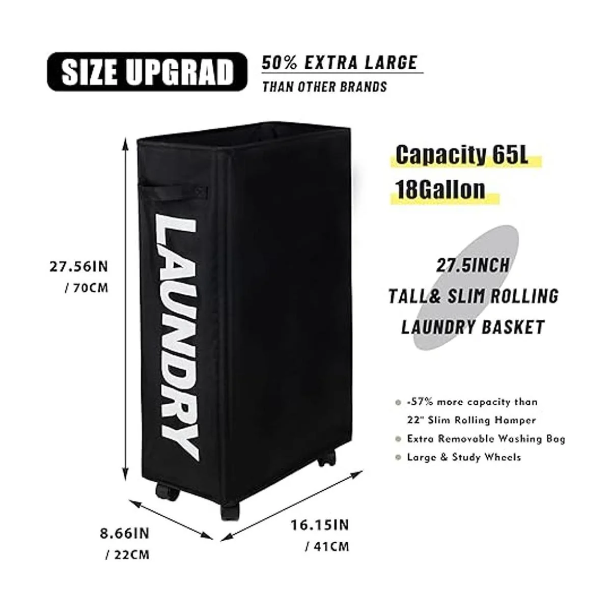 Tamaño Pro Plus de 27.5 pulgadas con ruedas más grandes: el cesto de lavandería rodante ha sido ampliado a un tamaño de 8.66 x 16.14 x 27.56 pulgadas 22 x 41 x 70 cm con ruedas más grandes, para que puedas poner más ropa en el cesto alto de lavandería y moverlo a otro lugar fácilmente. El freno adicional en la rueda puede mantenerlo quieto.