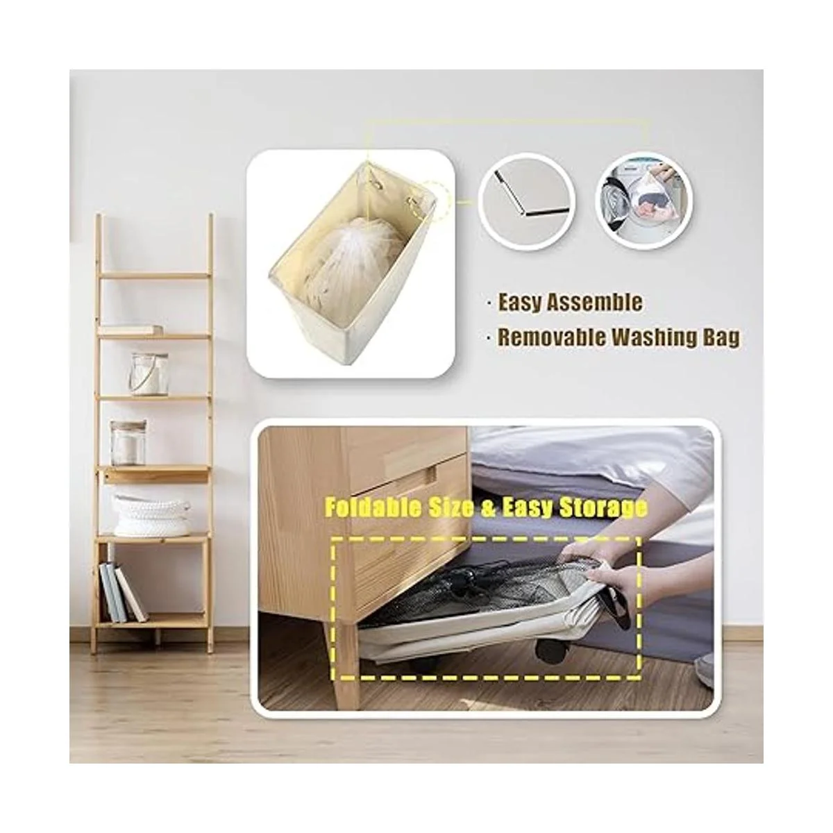 Estructura plegable para un fácil almacenamiento: puedes doblar el cesto de ropa plegable a un tamaño plano de 8.66 x 16.14 x 3.15 pulgadas 22 x 41 x 8 cm. Y la bolsa de lavandería desmontable se puede guardar en un cajón, armario, estante o automóvil para ahorrar espacio.