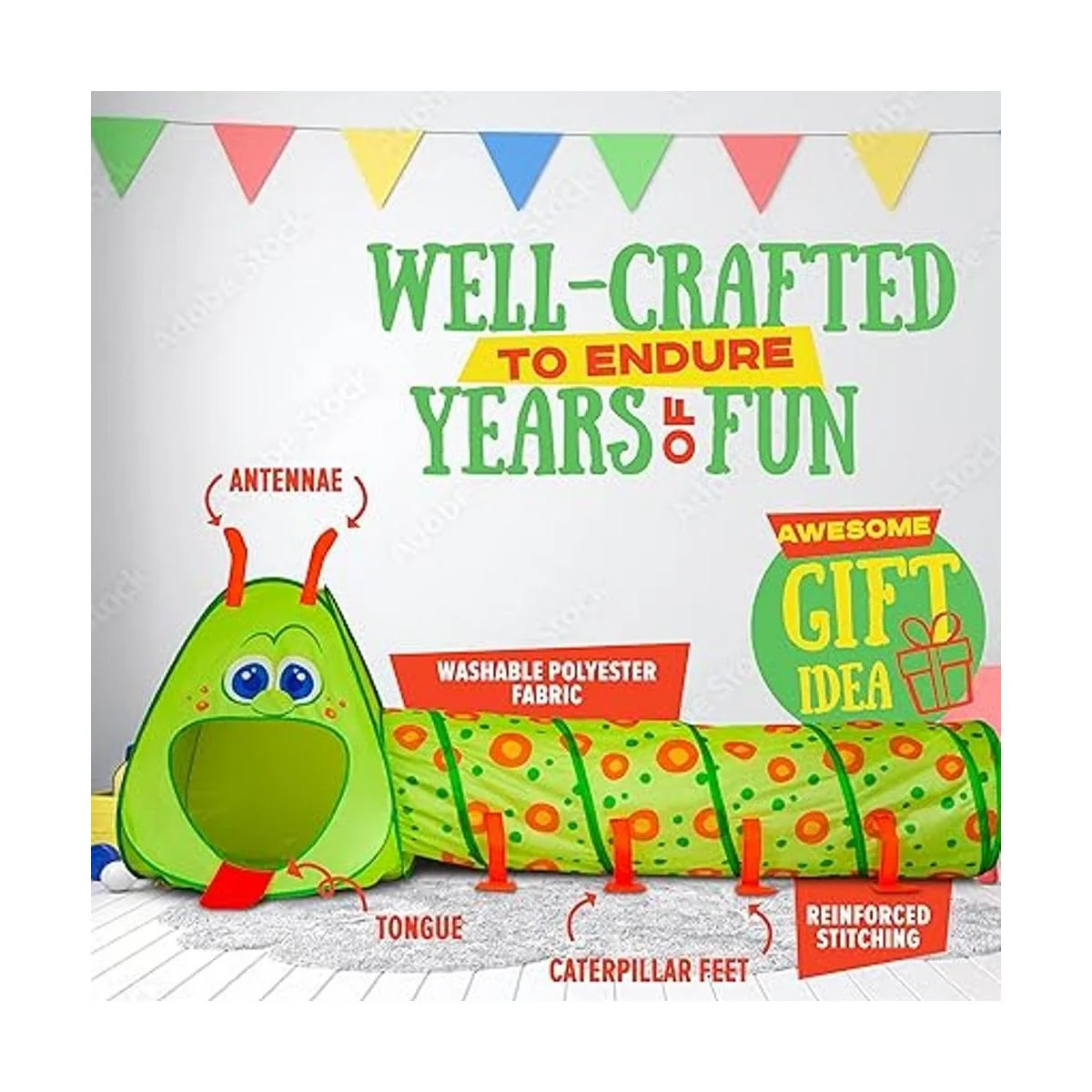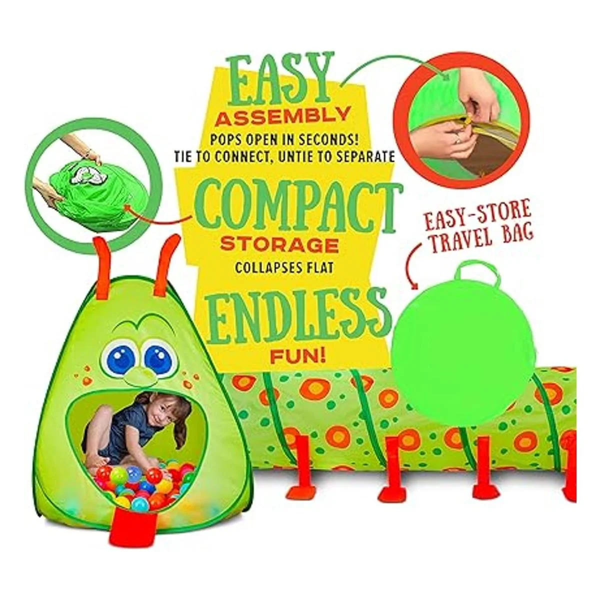 Apto para catering de boca grande: la tienda de campaña cuenta con una divertida oruga sonriente y de boca grande con lengua y antena y el túnel es un cuerpo largo con piernas