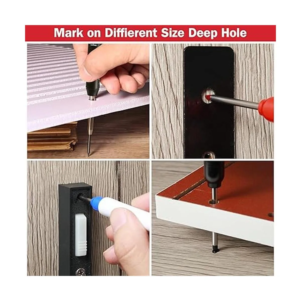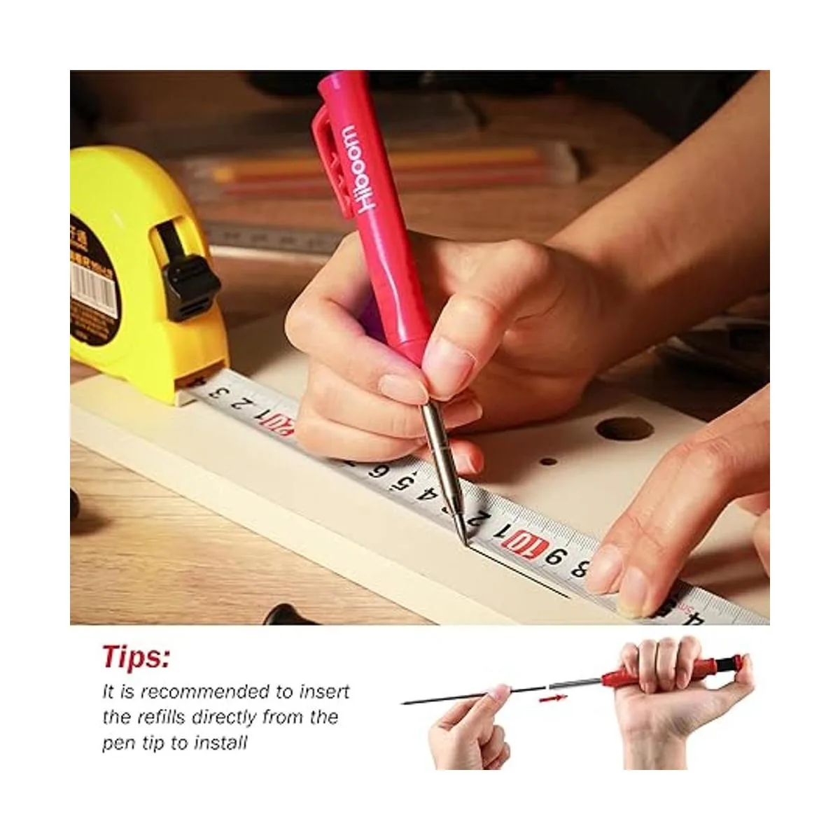Juego de marcadores de agujero profundo: hay 6 herramientas de marca con 2 cajas de recambios 12 piezas, los lápices mecánicos de carpintero se extienden 1.772 in de longitud, el bolígrafo seco se extiende 1.299 in, adecuado para marcar agujeros o en otras zonas estrechas