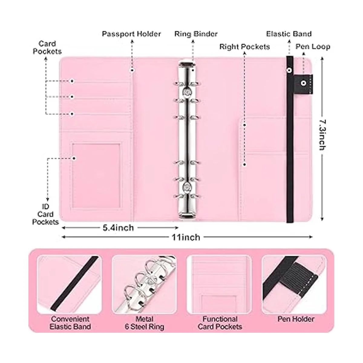 Práctico organizador de dinero: la funda con bolsillos con cremallera tiene varias fundas para tarjetas y trabillas para bolígrafos dentro de la cubierta delantera y trasera, almacena fácilmente tarjetas bancarias, tarjetas VIP, tarjetas de crédito, notas y bolígrafo. Los 6 bucles de acero inoxidable te permiten añadir o quitar artículos de forma flexible. La banda elástica permite que la capacidad se expanda aún más y también hace que sea más fácil de abrir y cerrar.