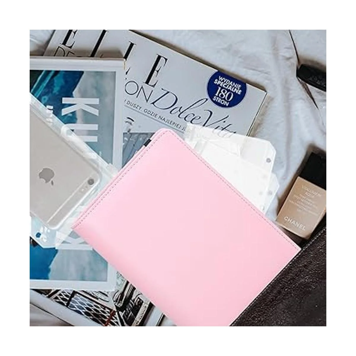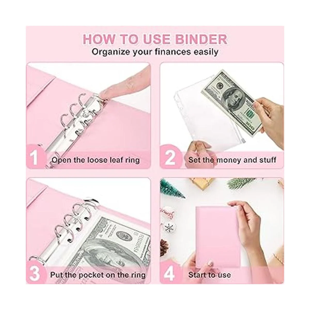 Carpeta de presupuesto con sobres de cremallera, calcomanías de cuero sintético A6 y accesorios con sobres de efectivo, mini carpeta de 6 anillos para ahorrar dinero rosa