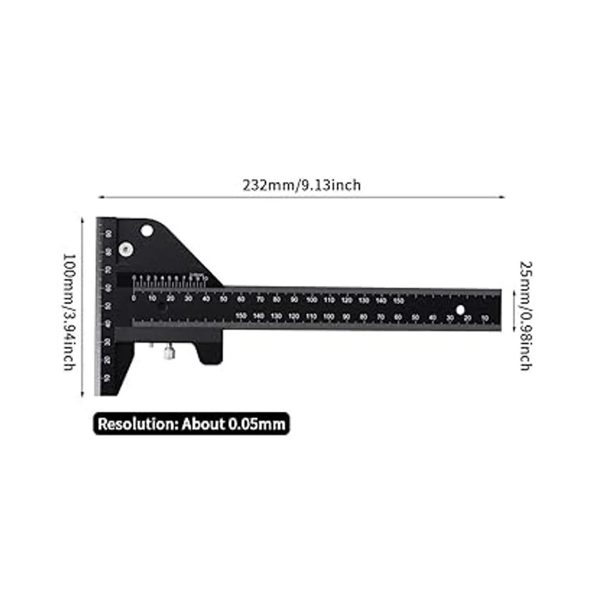 Regla T de medición precisa: el medidor múltiple te da la máxima precisión de marcado, lo que permite al usuario marcar con precisión hasta los milímetros más finos. La escala y la escala principal se han diseñado para deslizarse suavemente en el cuerpo principal y se ajusta perfectamente a los objetos. El medidor múltiple tiene un rango de medición mínimo más preciso que los calibres vernier regulares que pueden marcar hasta 1/20 0,05 mm que es de aproximadamente 0,019 pulgadas.