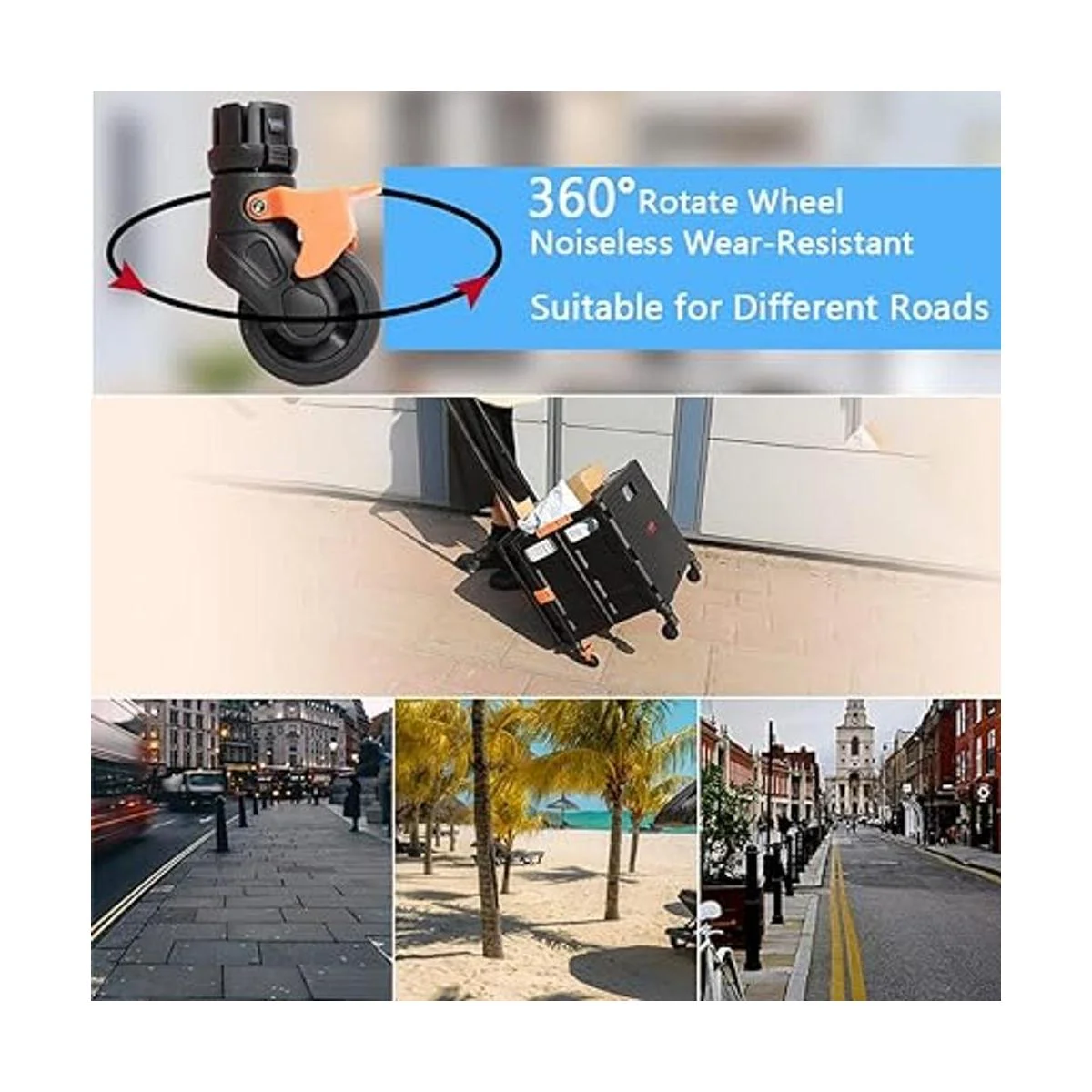 Diseño único de 4 ruedas giratorias, más práctico: este carrito plegable está equipado con 4 ruedas desmontables de rotación de 360, fácil de cambiar de dirección cuando se utiliza, y dos ruedas traseras con botón de freno pueden evitar que la plataforma se deslice cuando no se usa, no te preocupes, más útil.