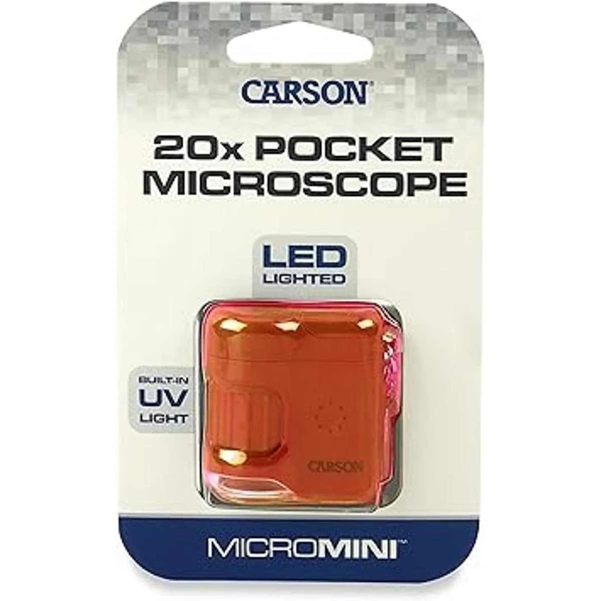 Carson MicroMini Microscopio de bolsillo con luz LED de 20 x con linterna UV y LED integrada, color naranja, mediano