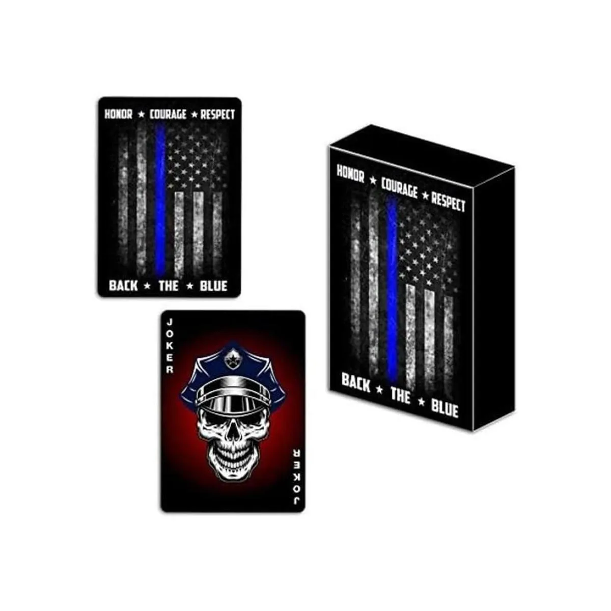 Nuestras cartas de policía hacen una declaración en la mesa de juego. El reverso de la tarjeta cuenta con la bandera Back the Blue con honor, coraje y respeto