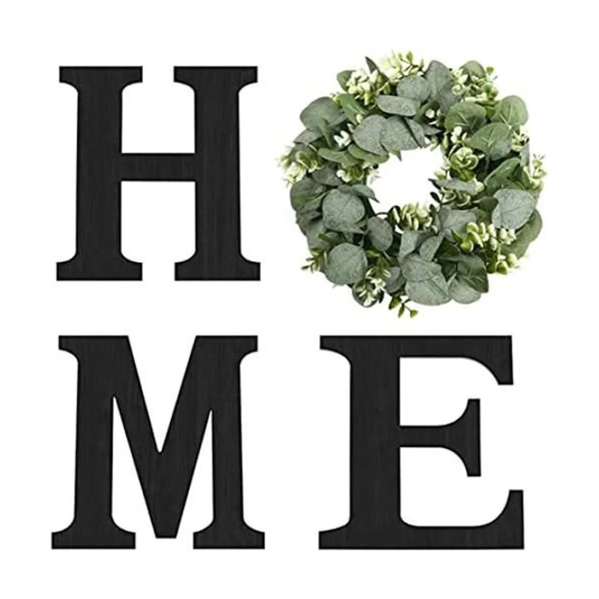Material: Las letras de madera para la decoración de pared están hechas de madera maciza pintada de negro; son resistentes y no se decoloran. La corona de hojas de eucalipto artificial está hecha de seda de alta calidad, polietileno, PVC, no tóxica y sin sabor.