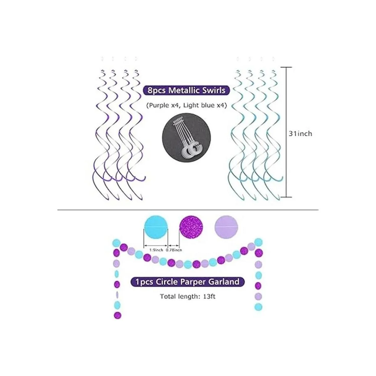 El banderín de cumpleaños de sirena mide 6 x 7.6 pulgadas, longitud de la pancarta de cumpleaños de sirena de 10 pies, longitud de la guirnalda circular de 13 pies, diámetro de la bola de panal de abeja de papel de 5.9 pulgadas y longitud de remolinos colgantes de 31 pulgadas después de colgar.