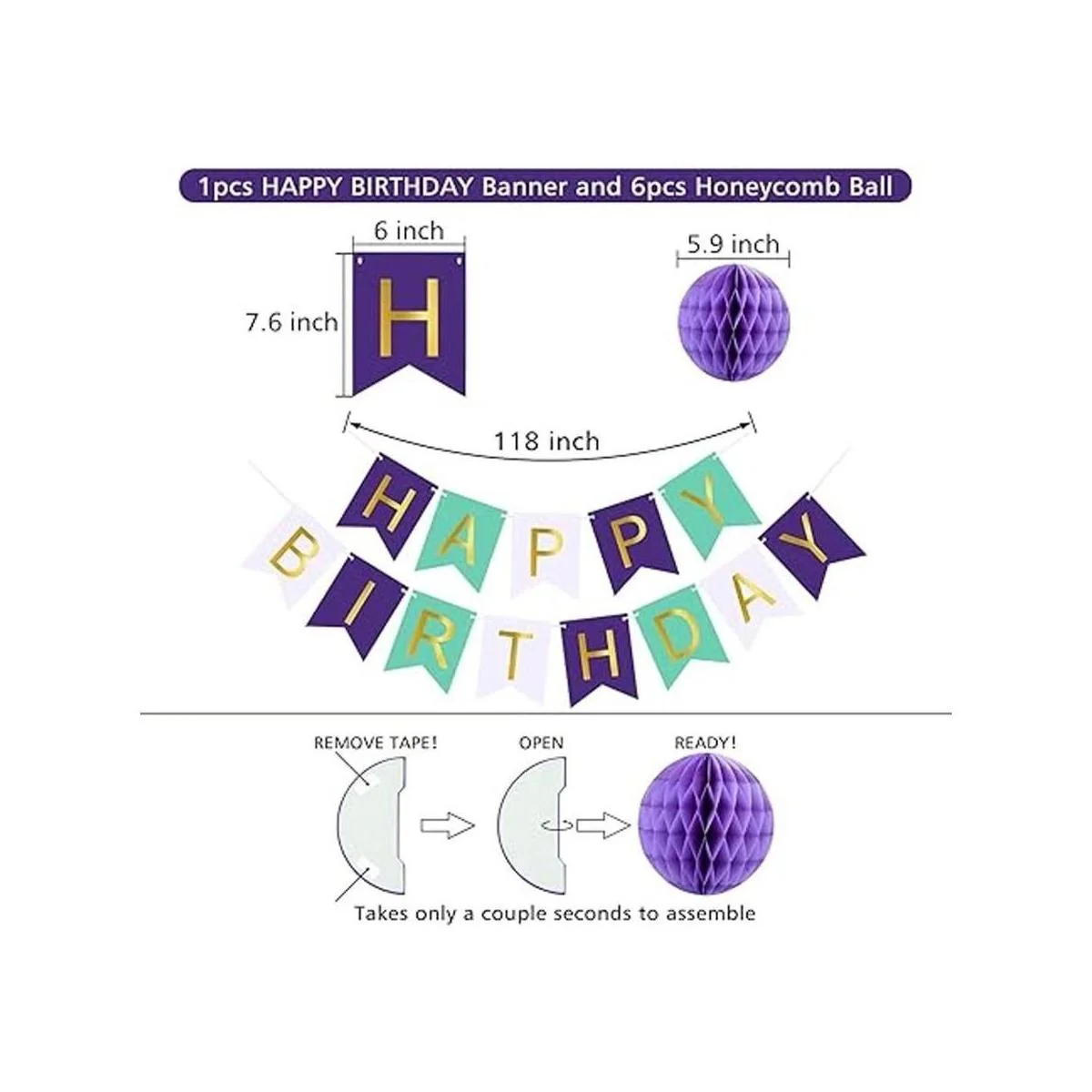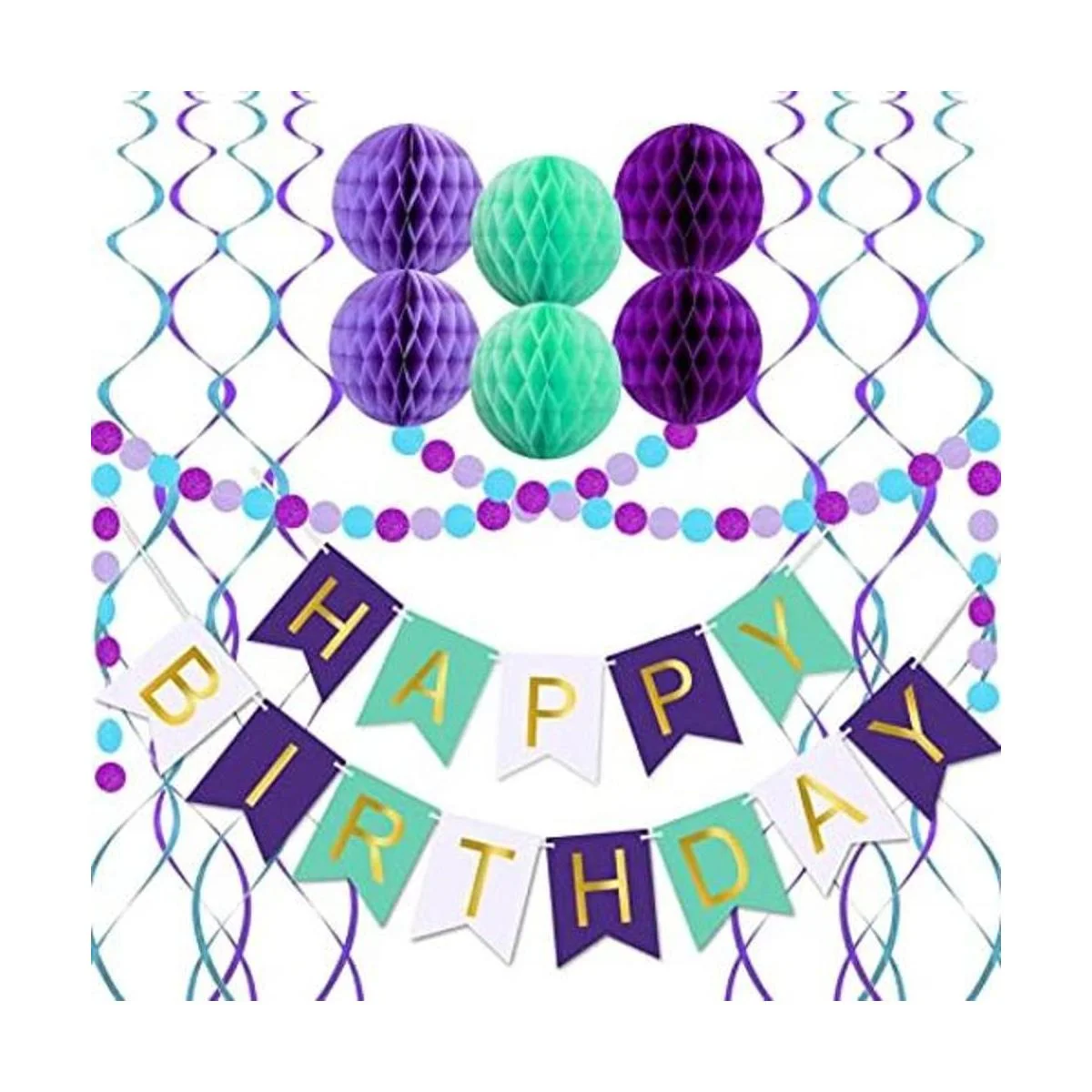 Lo que obtienes: 1 pancarta de feliz cumpleaños, 6 bolas de papel de panal, 1 guirnalda circular, 8 remolinos metálicos colgantes y nuestro amable servicio al cliente.