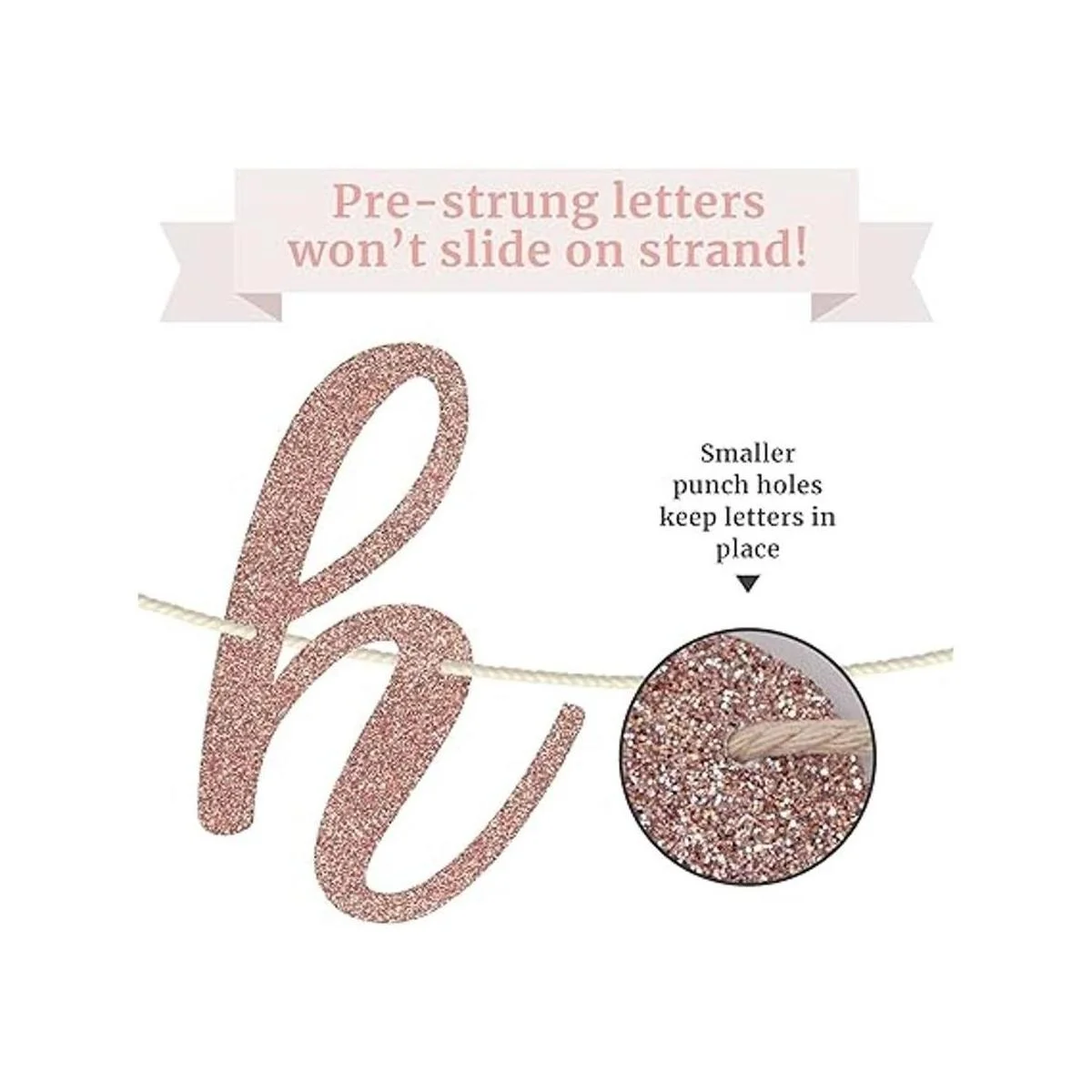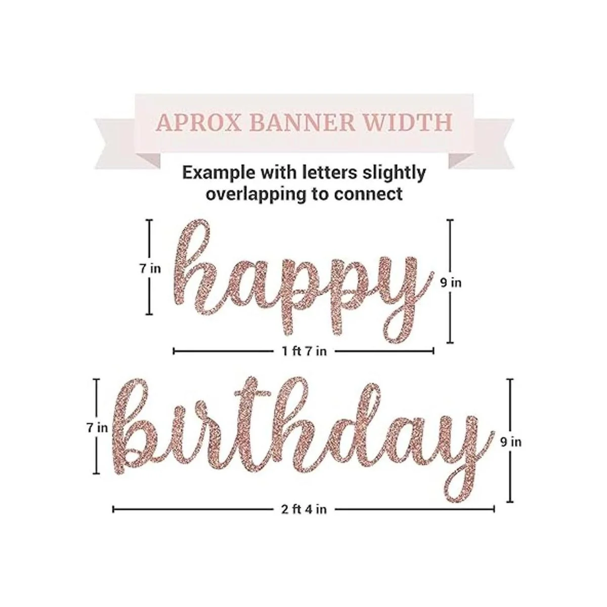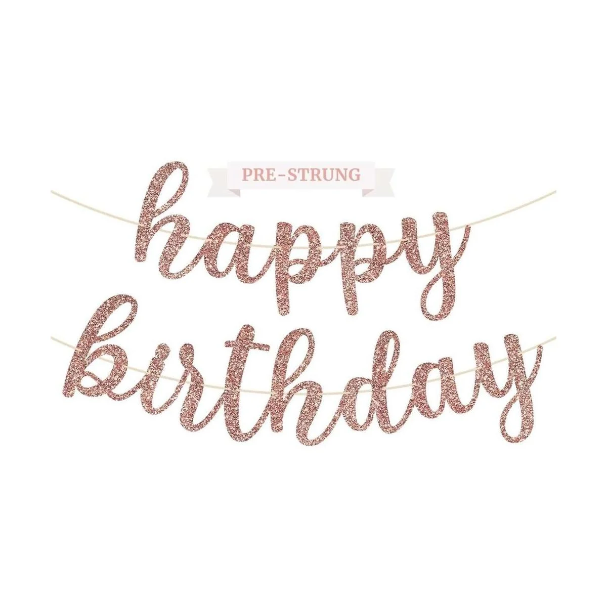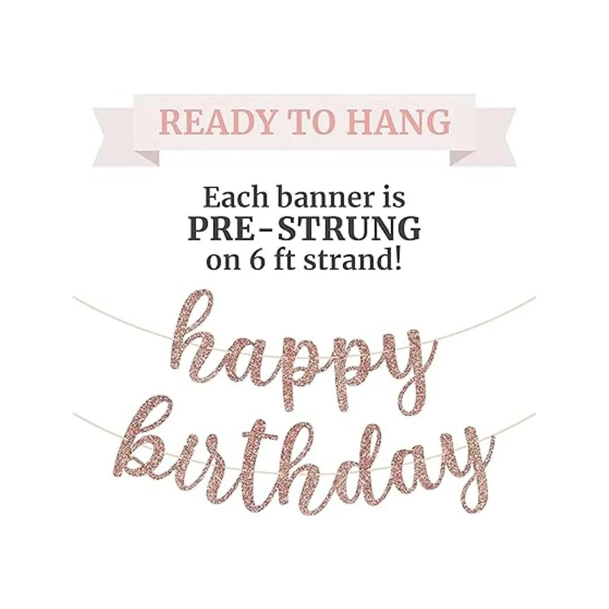 Cartel de feliz cumpleaños preencordado, sin bricolaje, pancarta de cumpleaños con purpurina de oro rosa en la escritura, guirnalda preencordada en hebras de 6 pies, decoraciones y decoración de fiesta de cumpleaños de oro rosa. Mencionamos que no hay