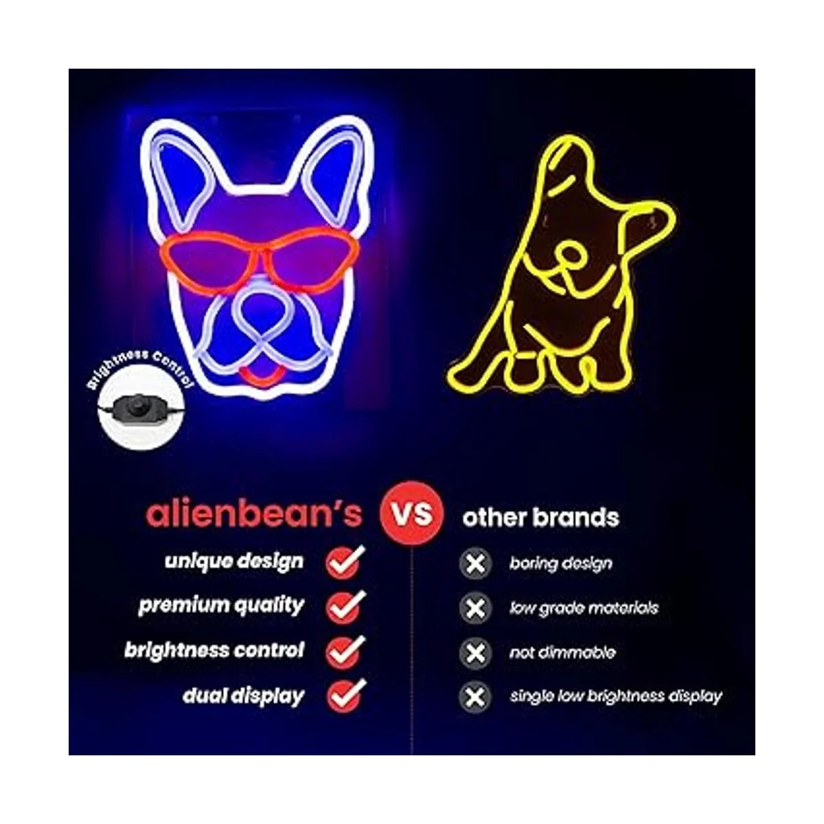 Función de atenuación Demasiado brillante No hay problema. A diferencia de otras luces de neón con solo un ajuste de brillo de luz, este adorable Frenchie viene con un control de intensidad para que puedas ajustar el brillo de la forma que veas que se ajusta. Desplázate hacia abajo para apagarlo.