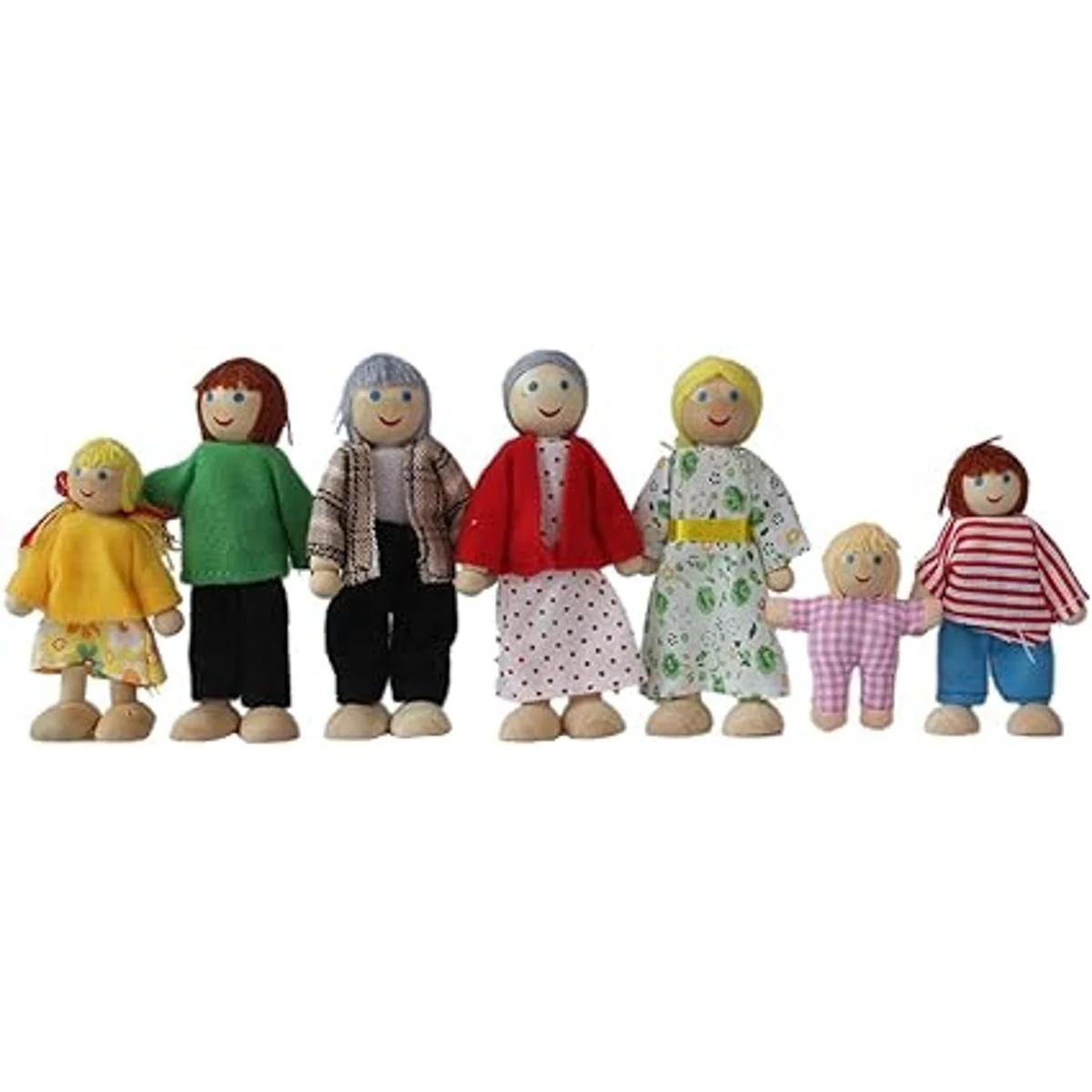 Casa de muñecas de madera, 7 figuras familiares, casa de muñecas en miniatura, casa de muñecas de madera, personajes familiares de disfraces, abuelo, abuela, mamá, papá, niño y niña