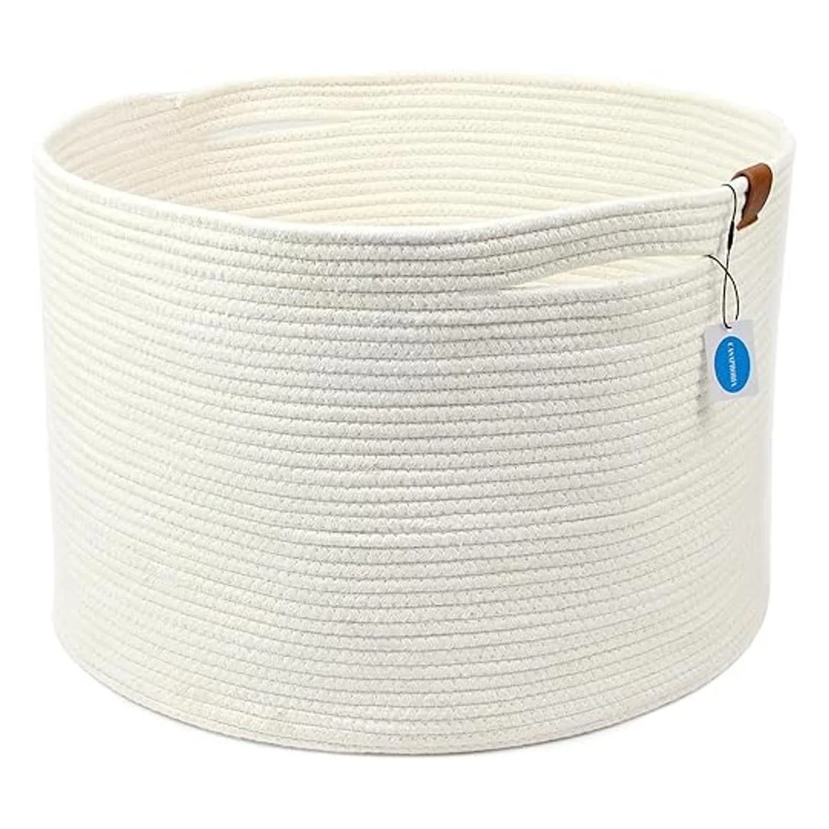 Casaphoria Canasta de almacenamiento extragrande para sala de estar, tejida con cuerda de algodón; para mantas, toallas, almohadas y juguetes blanco cremoso, de 21 x 13.8 pulgadas