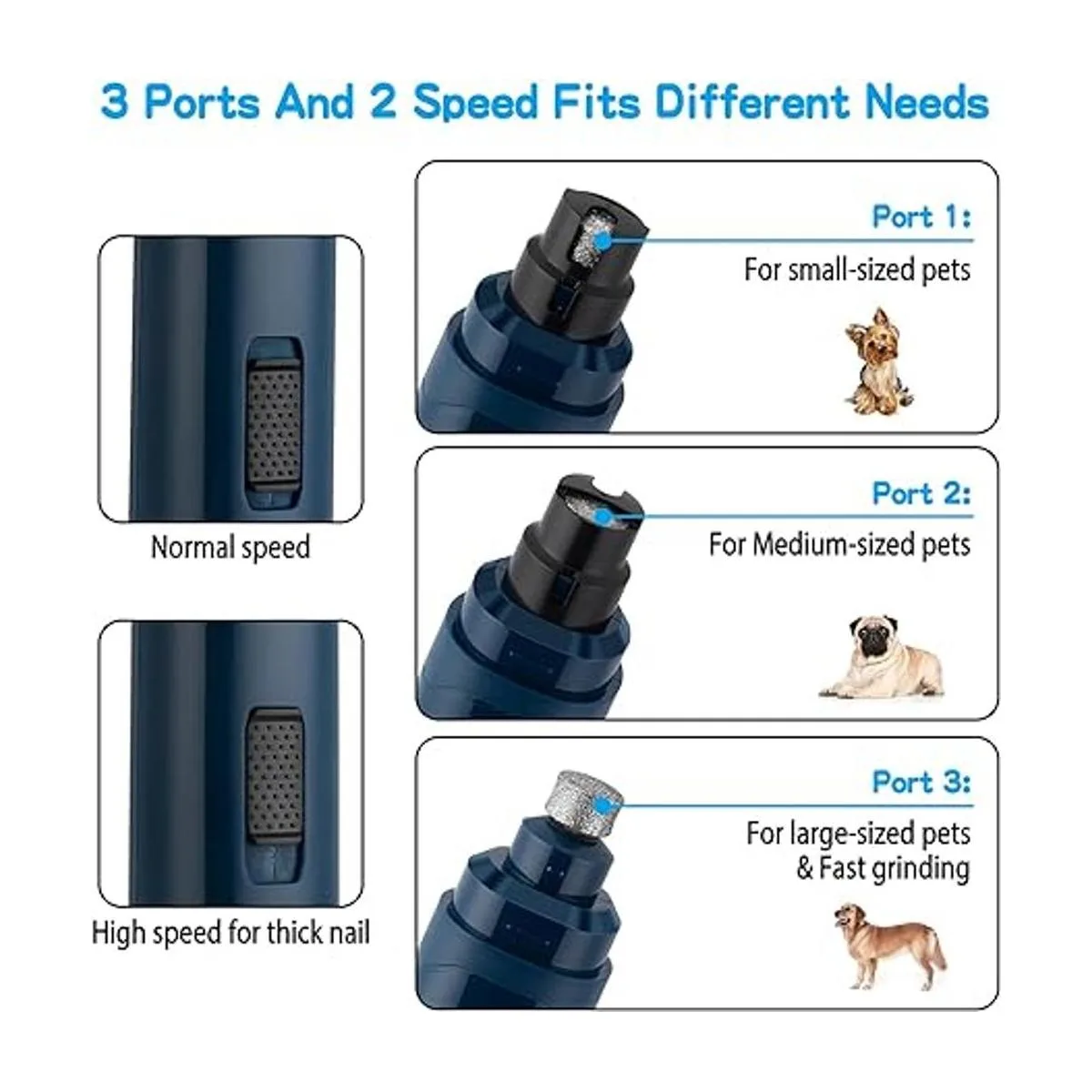 Interruptor avanzado de 2 velocidades y 3 puertos de esmerilado: El recortador cuenta con un diseño ajustable de baja velocidad lo suficientemente potente como para soportar el esmerilado intenso. Y con 3 puertos para adaptarse a las mascotas pequeñas, medianas o grandes. Simplemente elige el puerto y la velocidad adecuados según el tamaño y la dureza de las uñas de tu mascota.