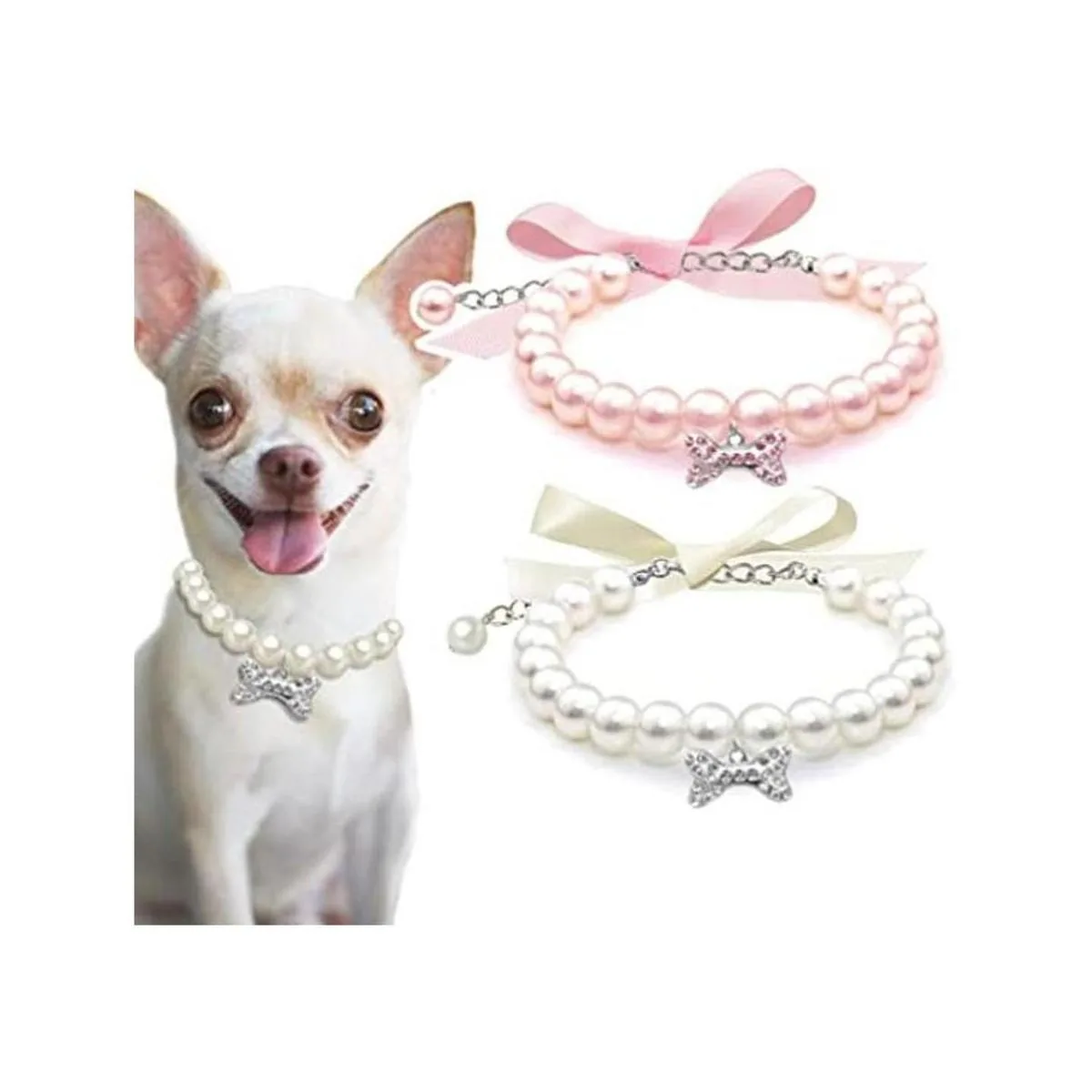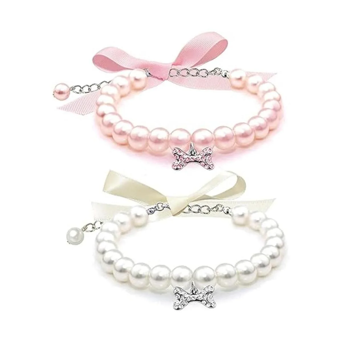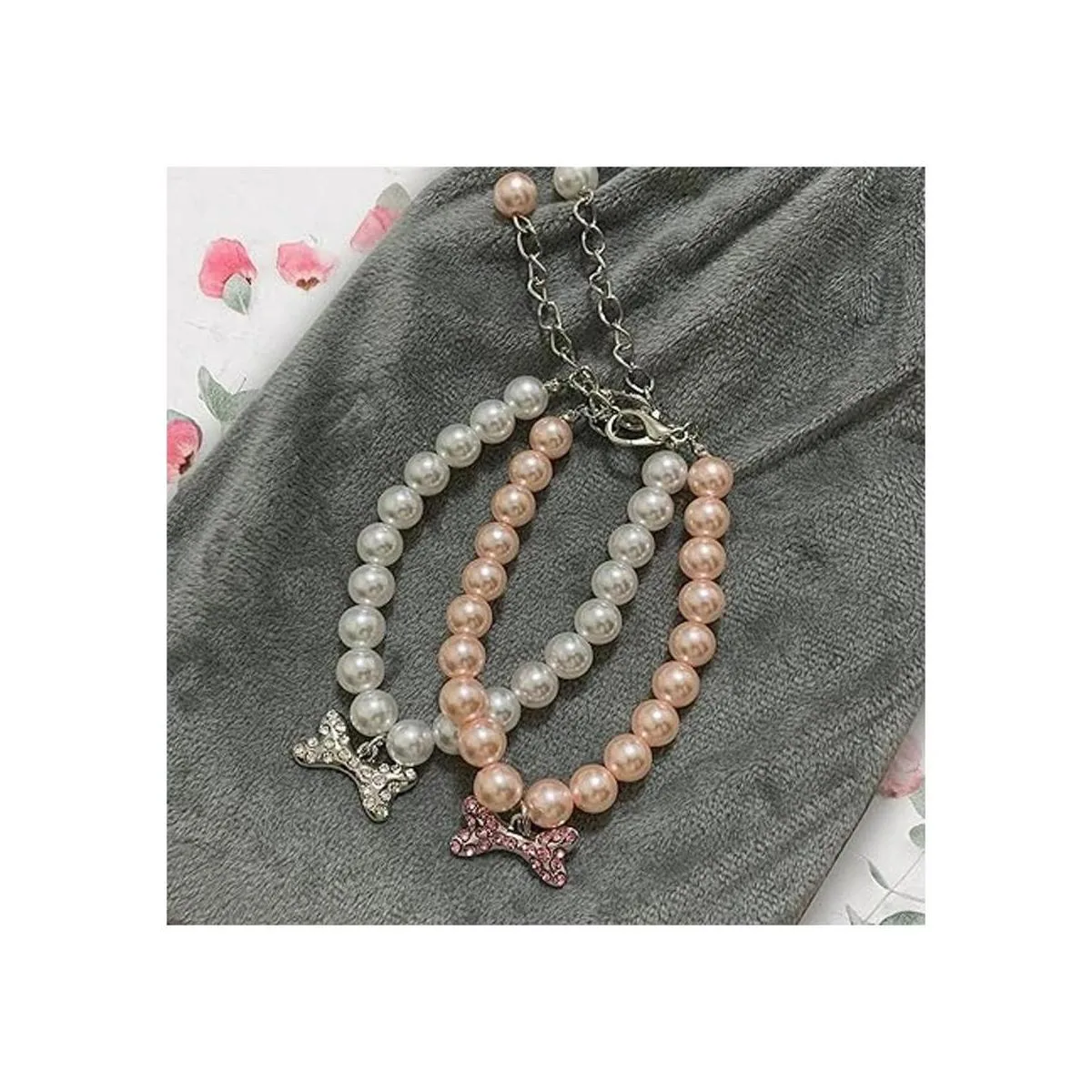 Casidoxi 2 collares de perlas para perros y gatos con hueso de diamantes de imitación, collar de boda para niñas, gatos, cachorros, accesorios rosa blanco