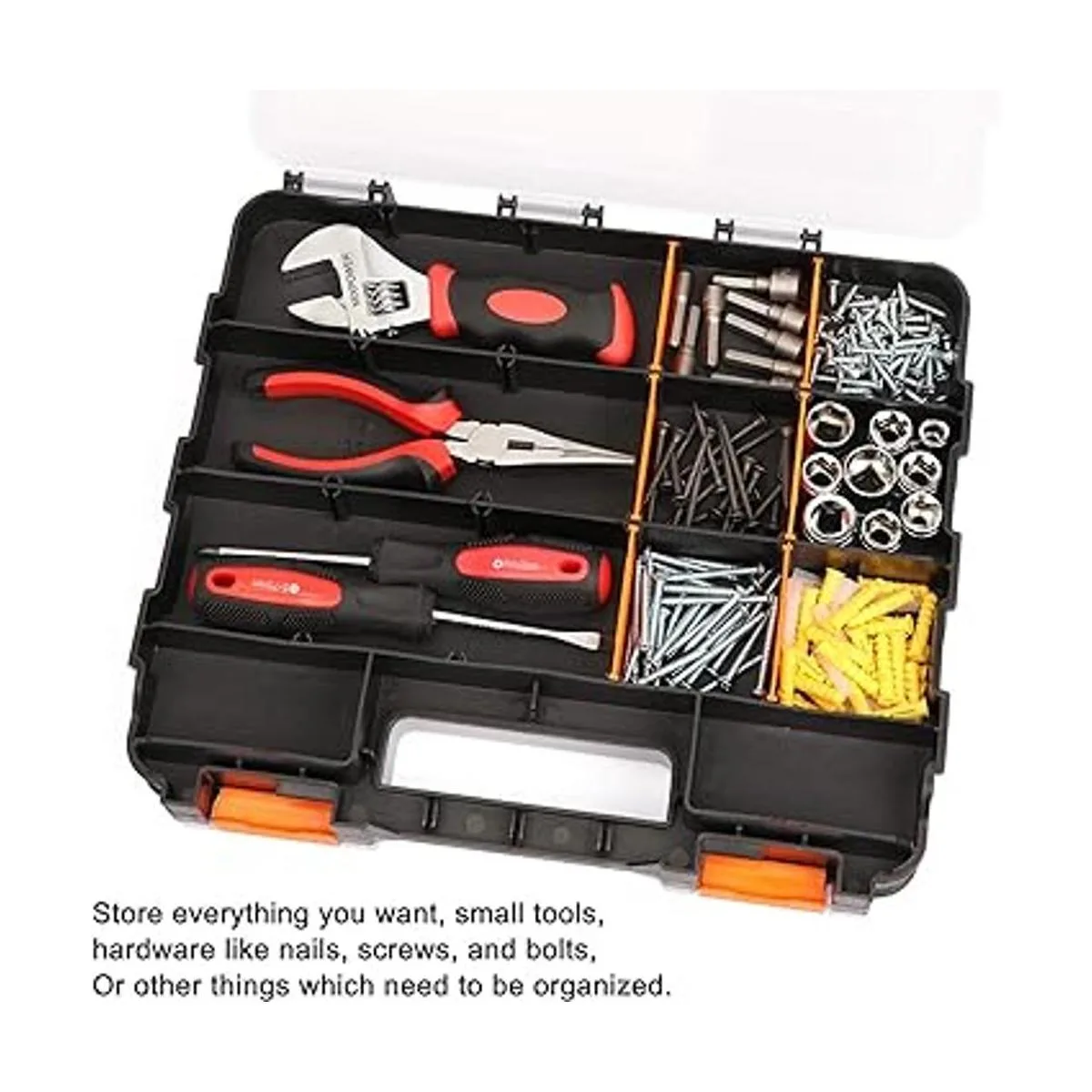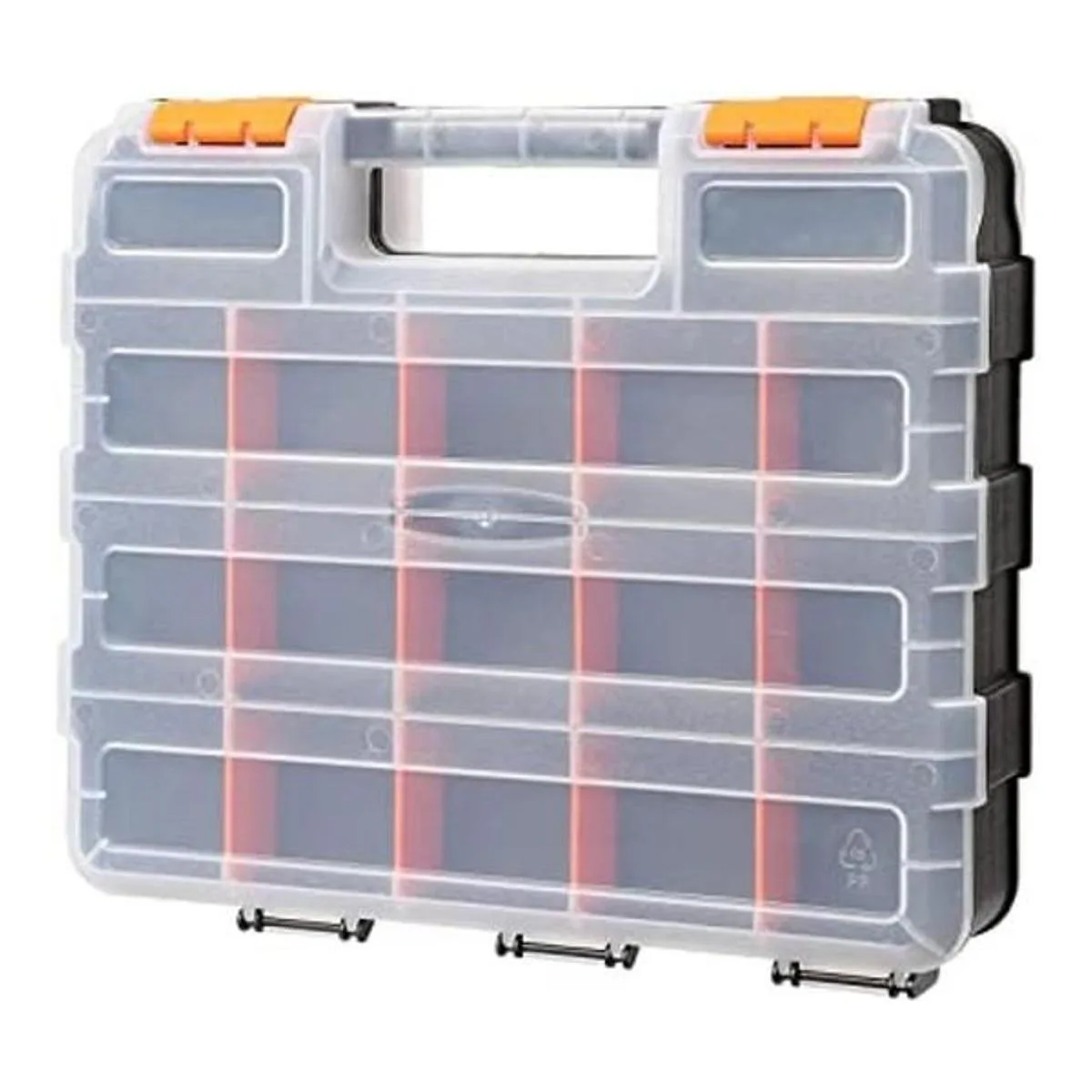 Made of durable and heavy duty plastic material. Double side design with professional looking. An attractive color combination in black body, clear lids, orange closure and divider pieces