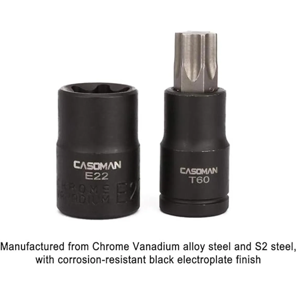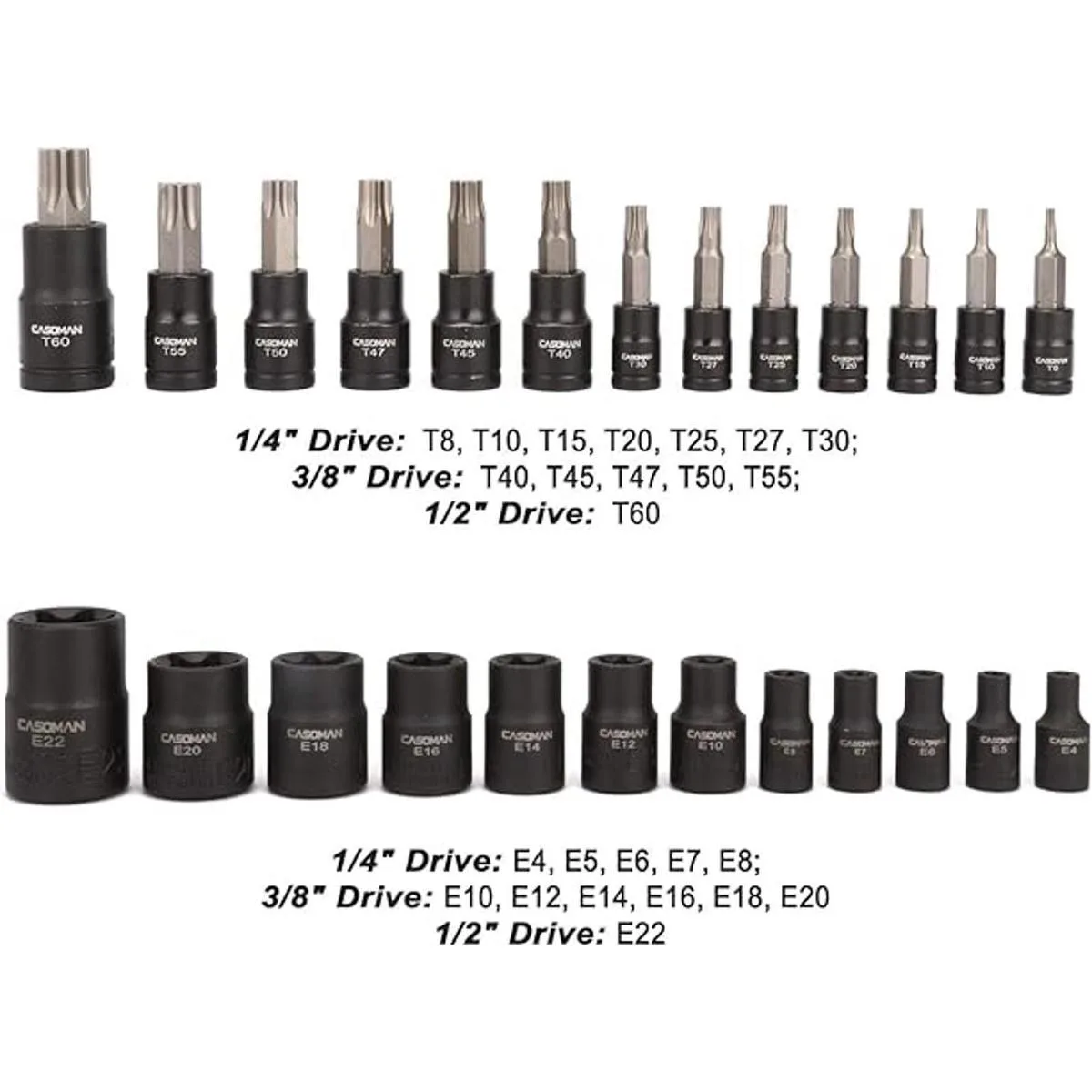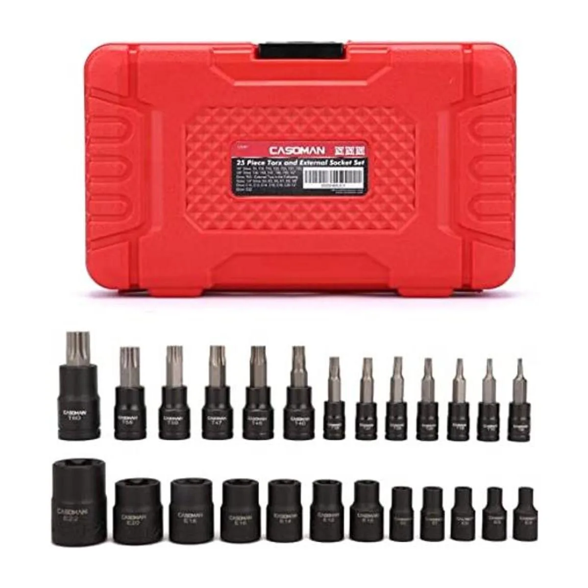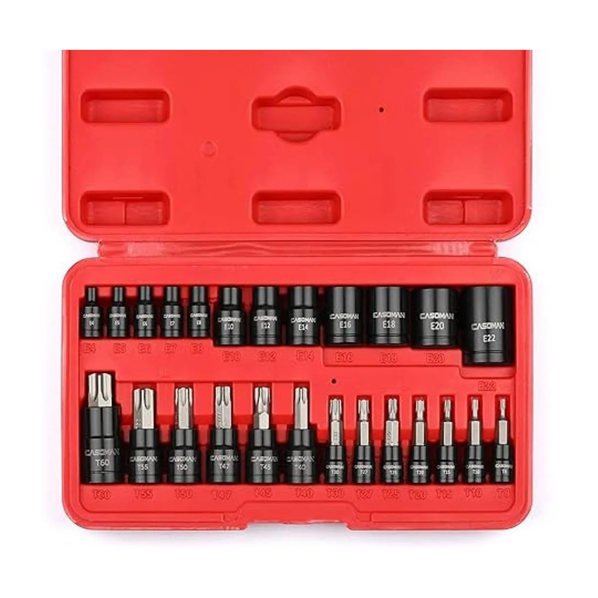CASOMAN Juego de 25 piezas de enchufe Torx y enchufe externo hembra, 13 puntas de enchufe de estrella T8 T60 y 12 enchufes hembra ETorx E4E22