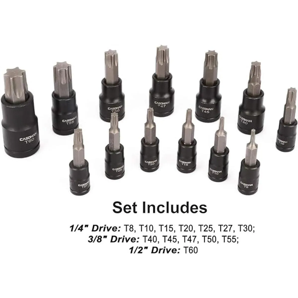 El juego incluye: 13 puntas de enchufe estrella de 1/4 pulgadas. Unidad: T8, T10, T15, T20, T25, T27, T30; Unidad de 3/8 pulgadas: T40, T45, T47, T50, T55; Unidad de 1/2 pulgada: T60