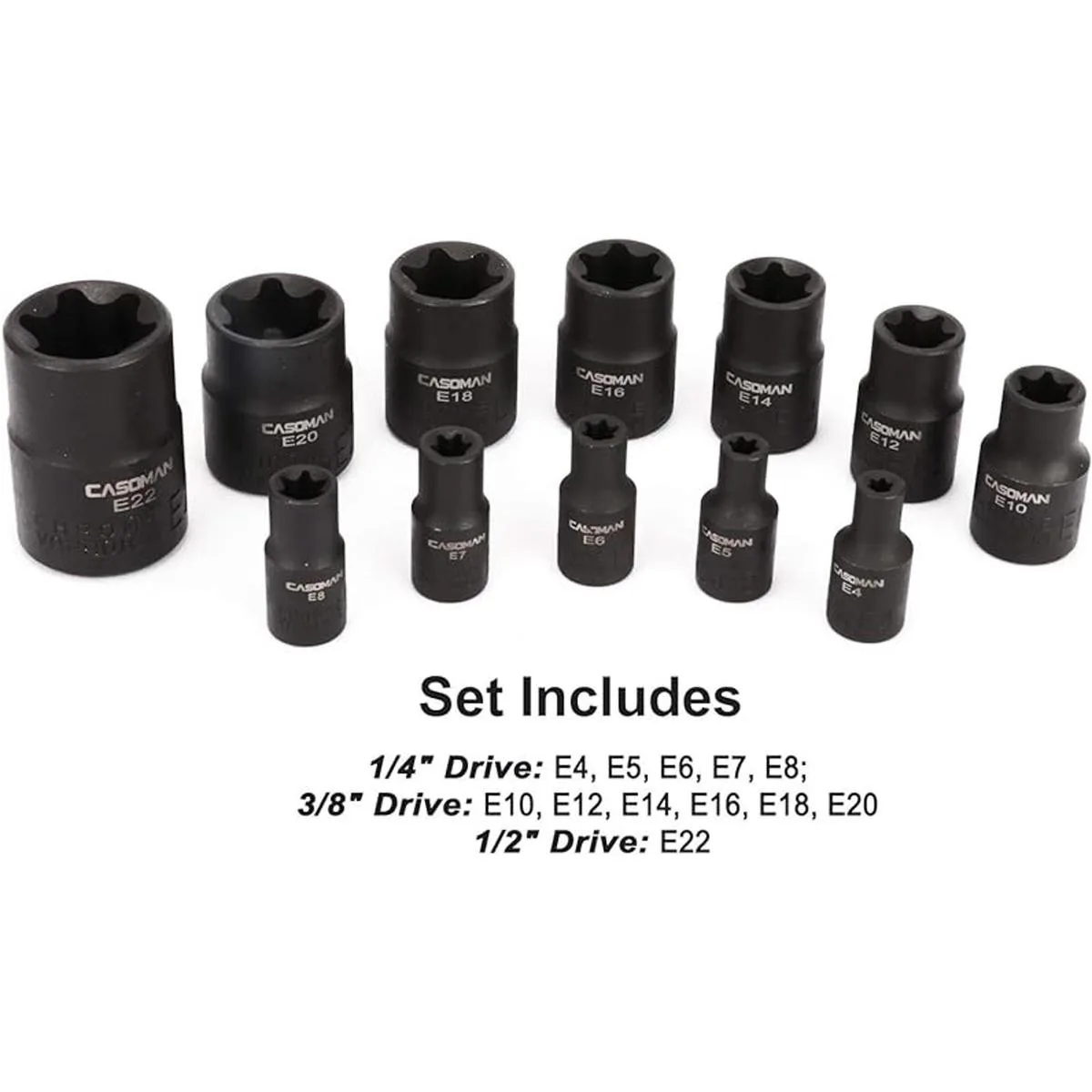 El juego incluye: 12 enchufes ETorx hembra: 1/4 pulgadas. Unidad: E4, E5, E6, E7, E8; Unidad de 3/8 pulgadas: E10, E12, E14, E16, E18, E20 1/2 pulgadas. Unidad: E22