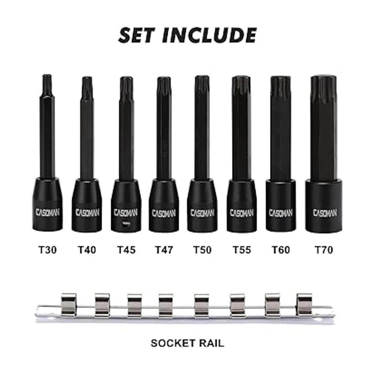 El juego incluye: 3/8 pulgadas Dr. Juego de llaves de vaso Torx extra largas: T30 T40 T45 T47 T50 T55 T60 T70 un riel de enchufe para almacenamiento y organización.
