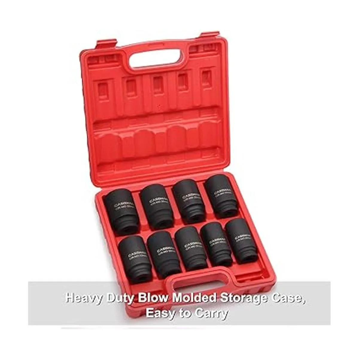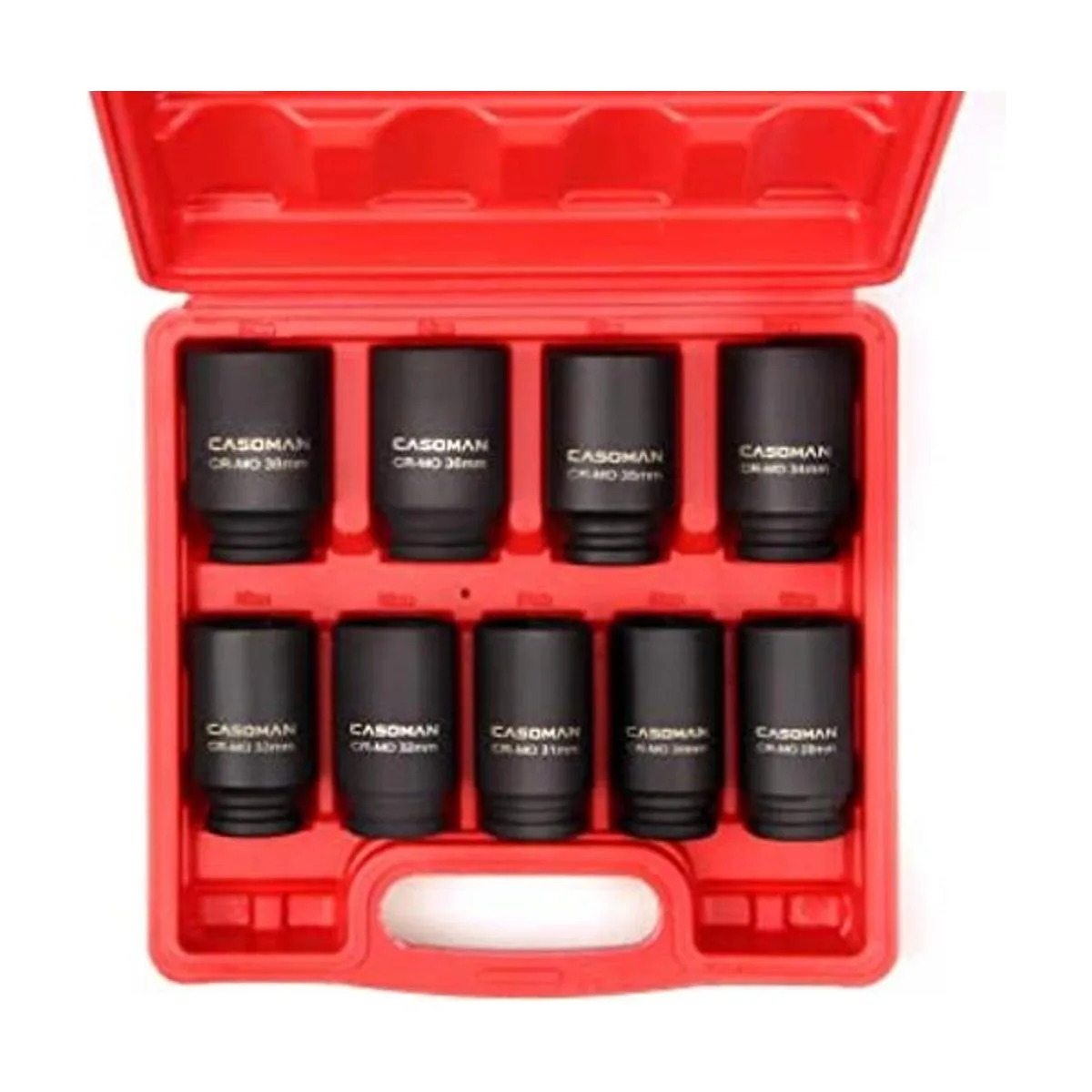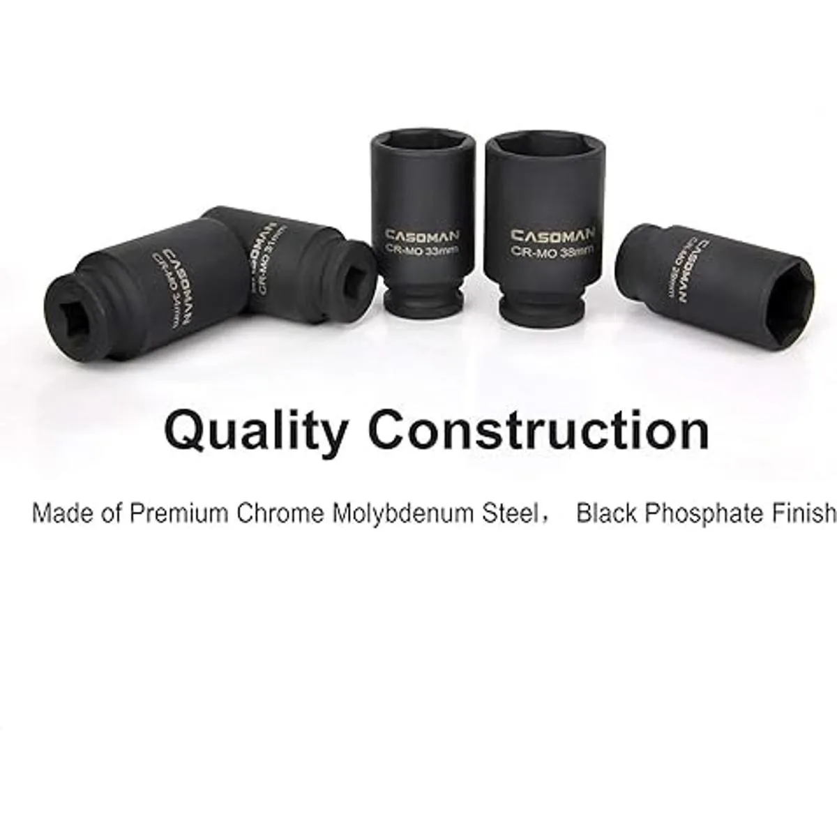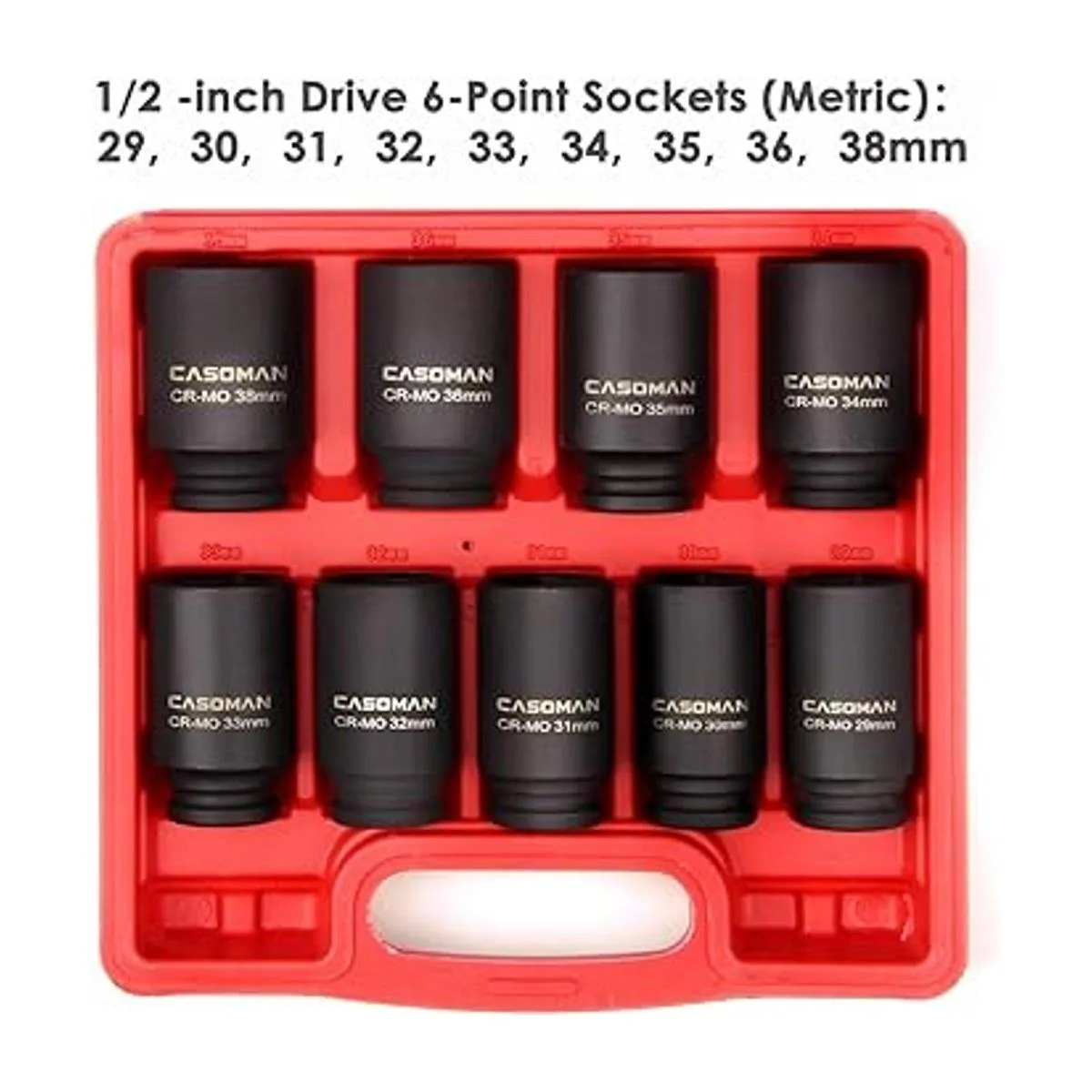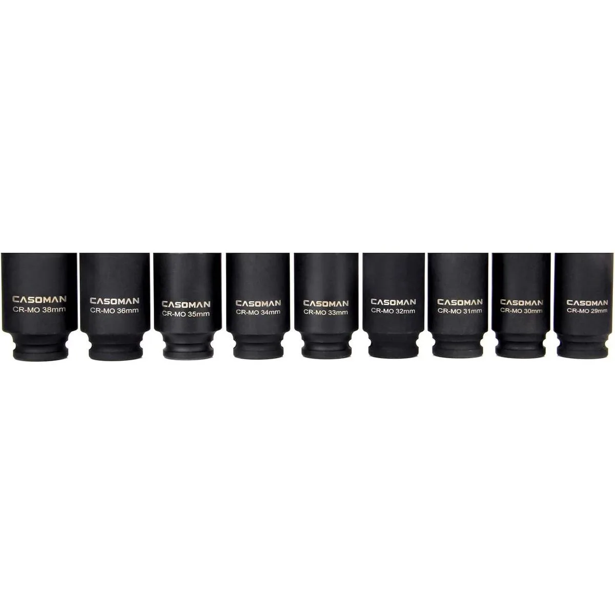 CASOMAN Juego de llaves de impacto de tuerca de eje profundo de 12 pulgada, 6 puntos, CRMO, métrica, 1.142 in1.496 in, 9 piezas de 12 pulgada Dr. Deep Impact Socket Set