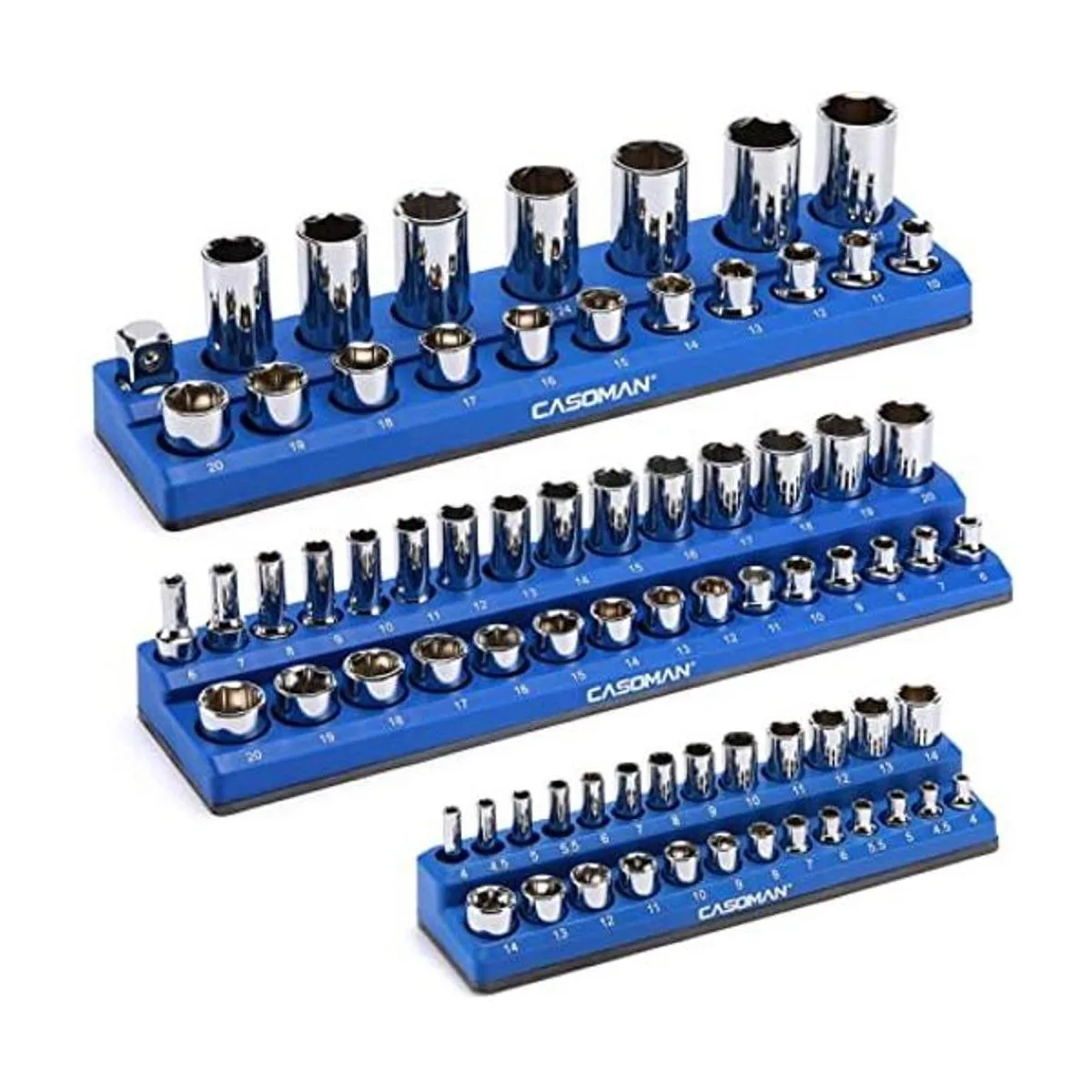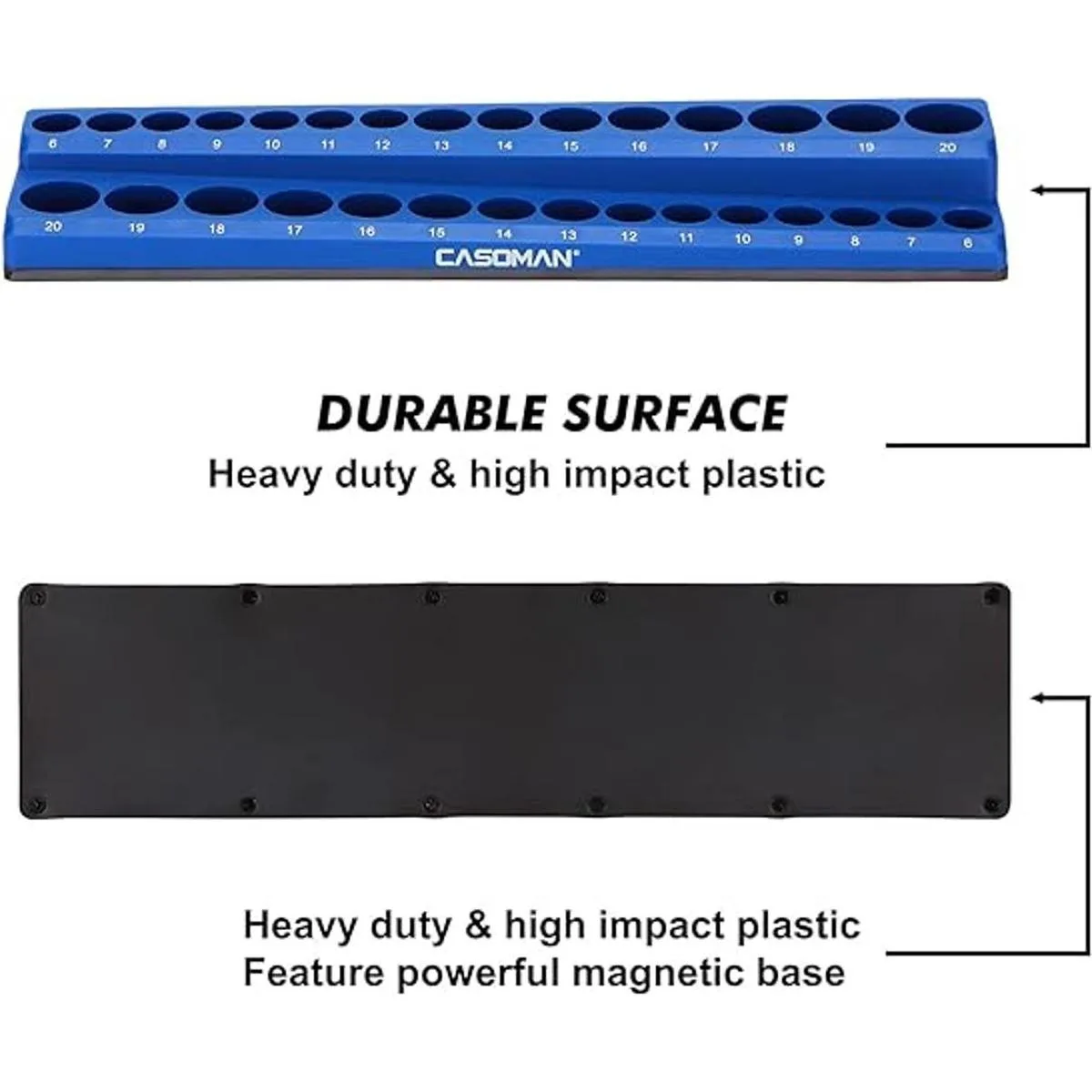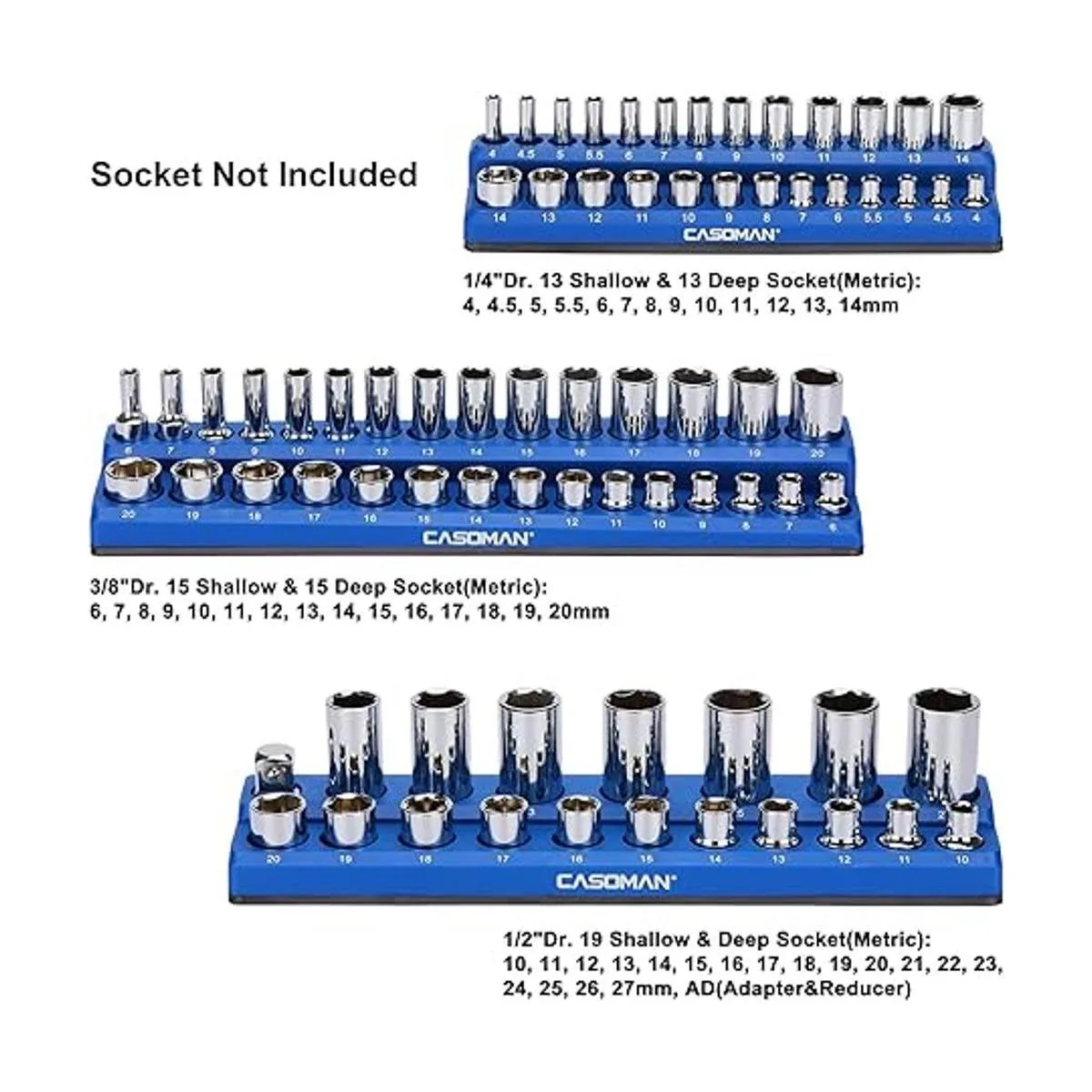 CASOMAN Organizador de llaves magnéticas, kit de soporte de 3 piezas, 12 pulgadas, 38 pulgadas, 14 pulgadas, capacidad para 75 enchufes métricos, color azul, organizador de herramientas de calidad profesional, enchufe no incluido