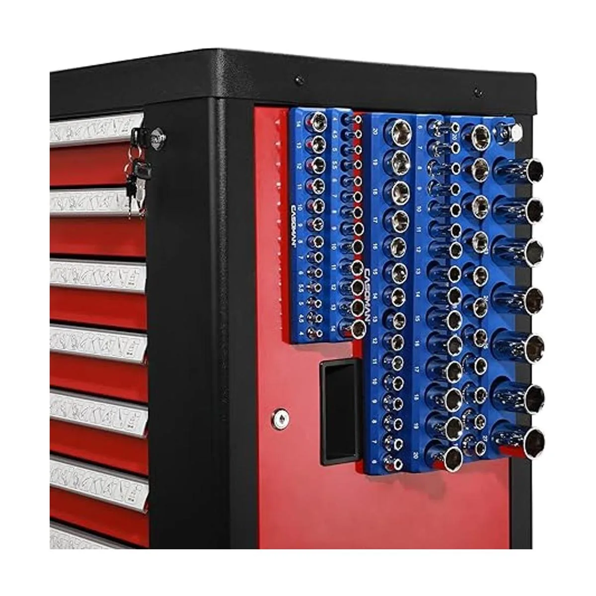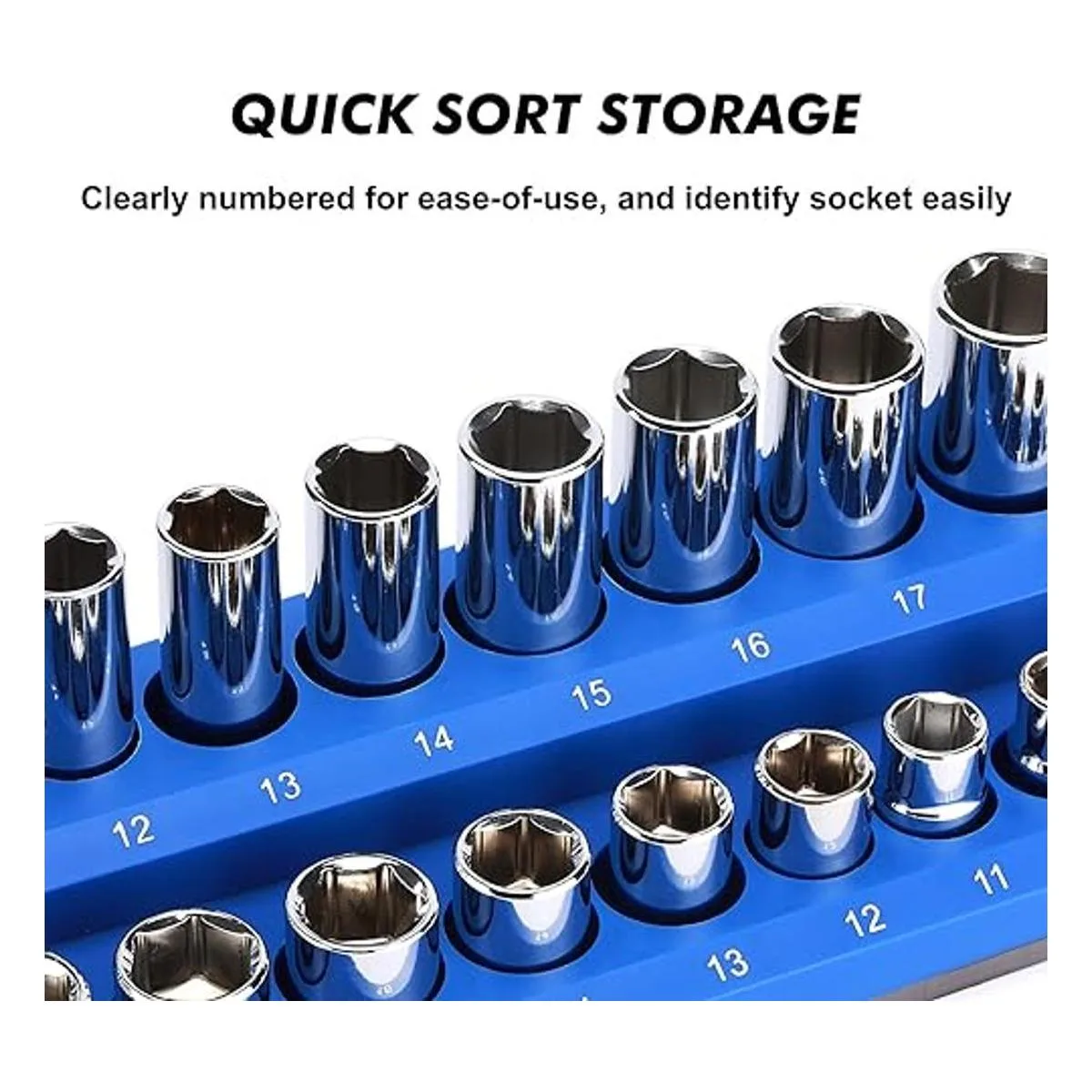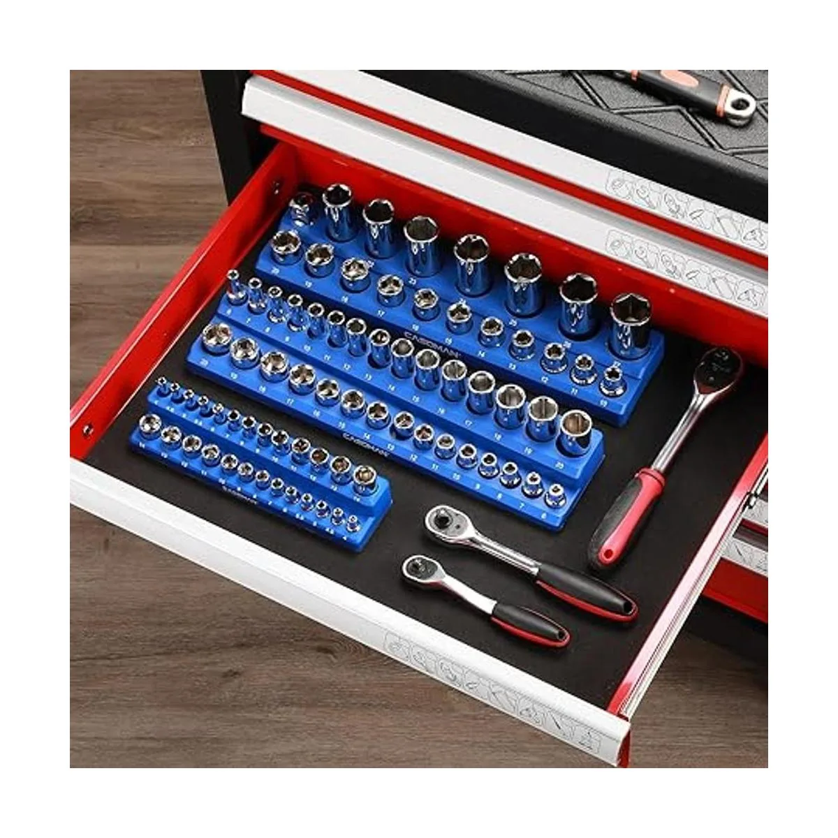 CASOMAN Organizador de llaves magnéticas, kit de soporte de 3 piezas, 12 pulgadas, 38 pulgadas, 14 pulgadas, capacidad para 75 enchufes métricos, color azul, organizador de herramientas de calidad profesional, enchufe no incluido