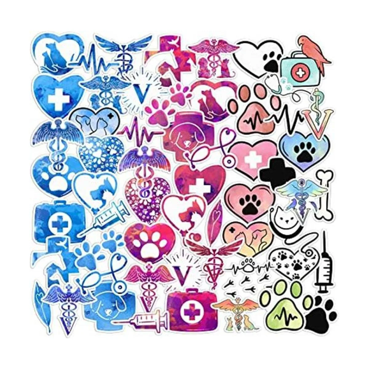 Cavka Paquete de 58 calcomanías veterinarias a granel para agenda, botella de agua, portátil, cuaderno veterinario de oficina, regalo de clínica, juego de médicos, calcomanías de vinilo impermeable para patas de perro para enfermeras, linda tecnología veterinaria
