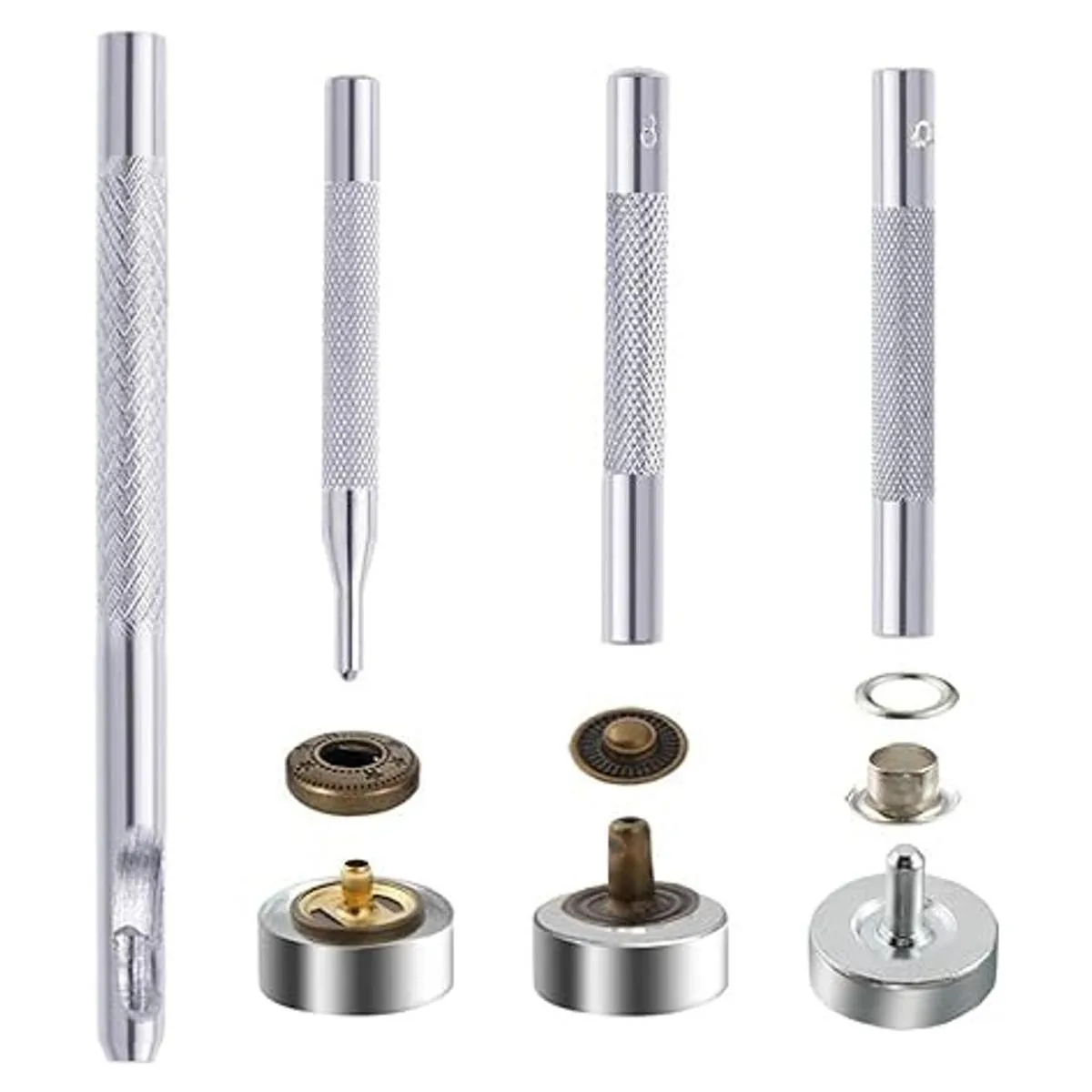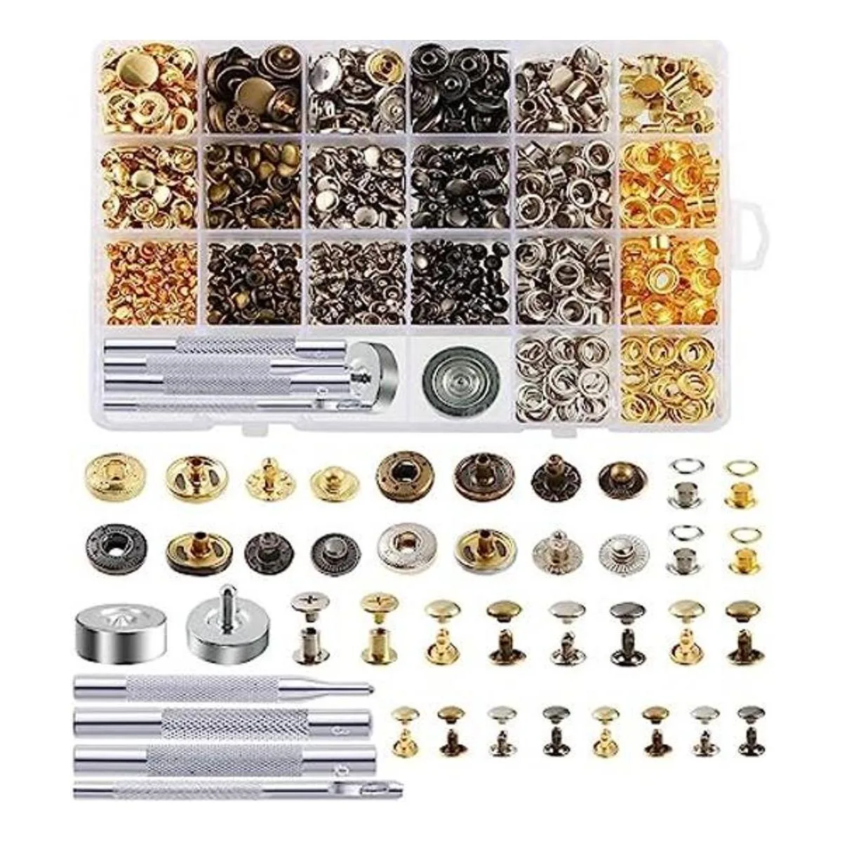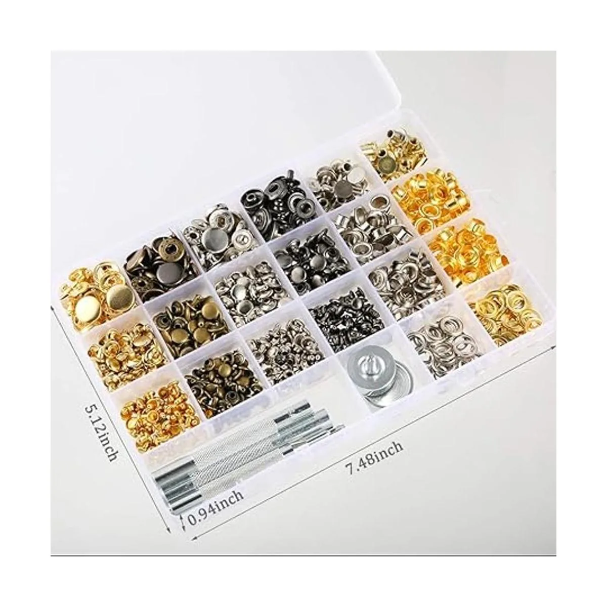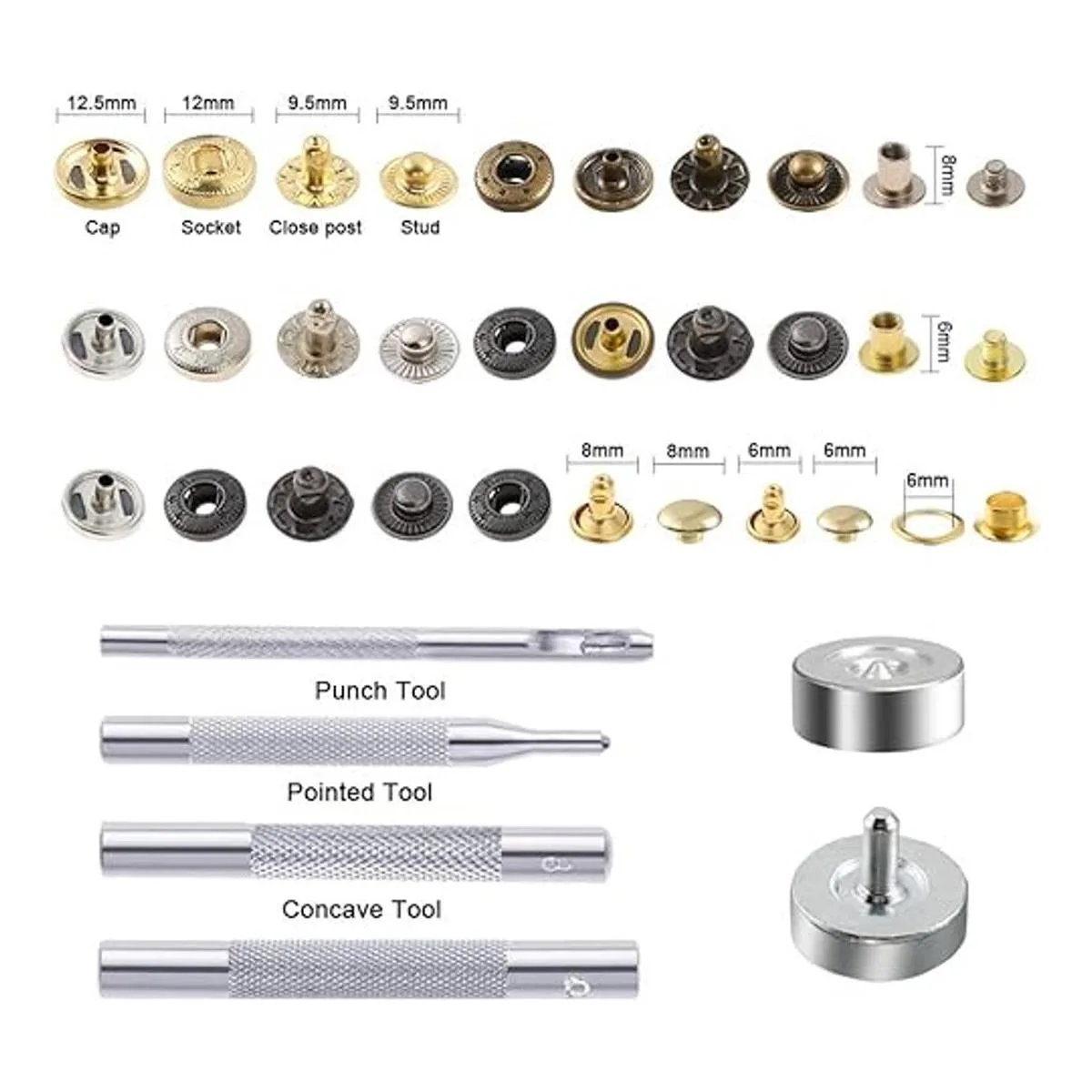 Caydo Juego de 400 cierres a presión de 4 estilos, incluye remaches de cuero, ojales, ojales, tornillos de fijación, botones a presión con herramientas de fijación para cuero fino, chaqueta, jeans