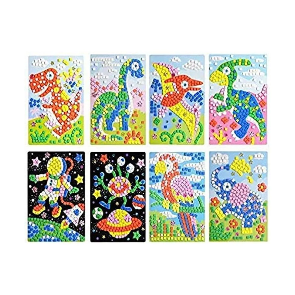 Paquete de valor: 8 diseños diferentes de mosaicos adhesivos, incluyendo loro, elefante, astronauta, extraño y dinosaurios, todos individualmente, perfecto para darles a los niños como regalo de Navidad y Año Nuevo.