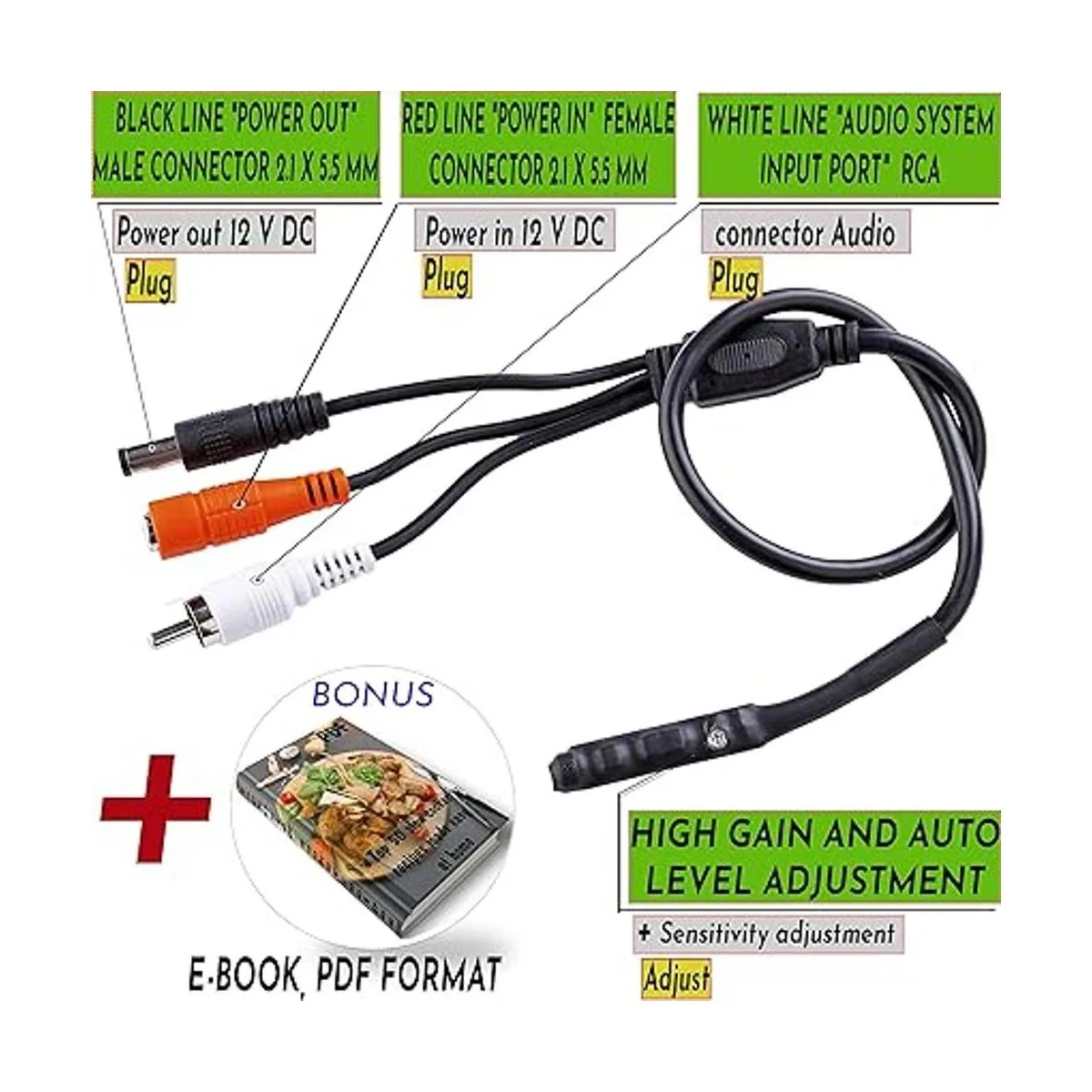 SURVEILLANCE MICROPHONE HAS High gain and auto level adjustment sensitivity adjustment. Qualitative elements and the modern design of the microphone make it the leader in the US market.