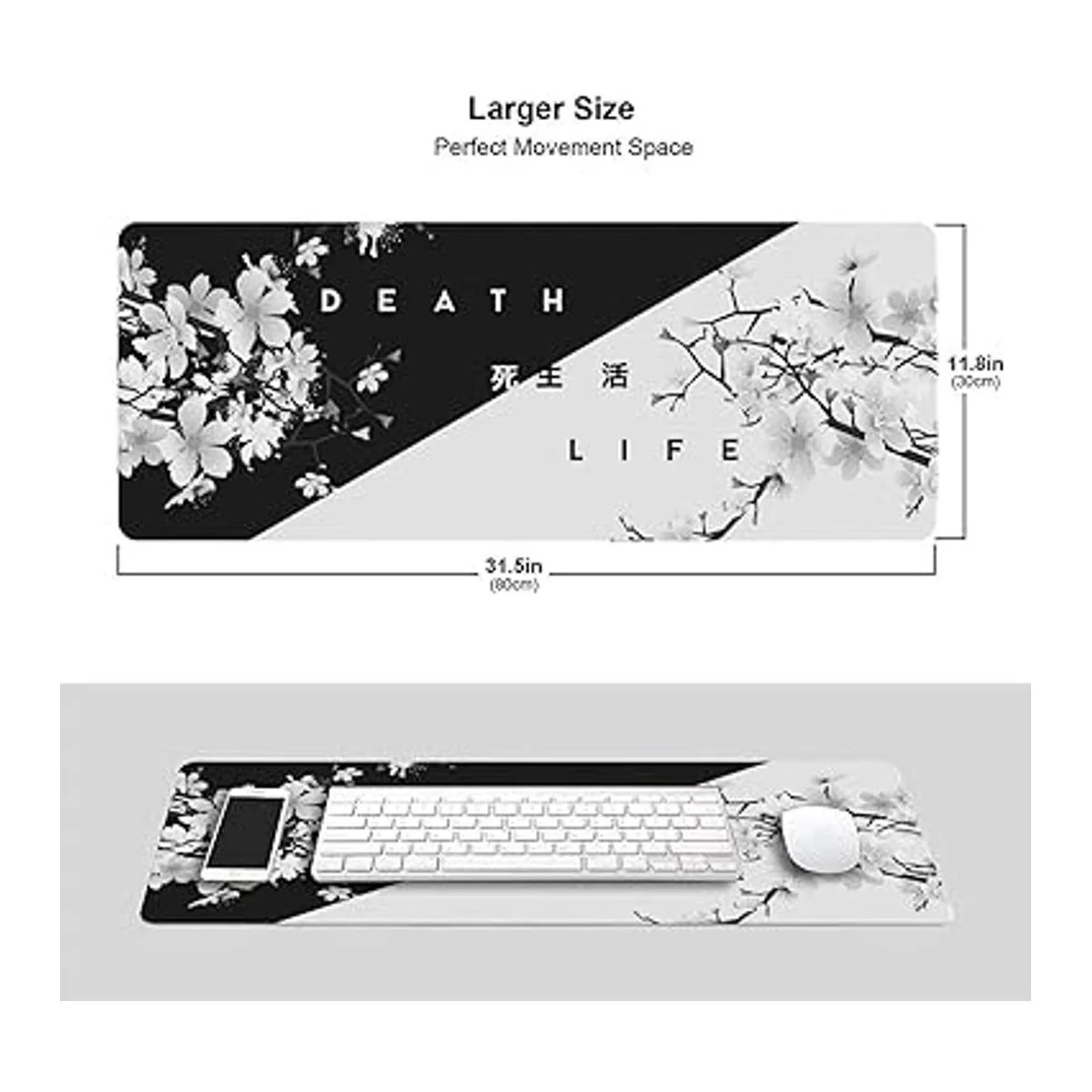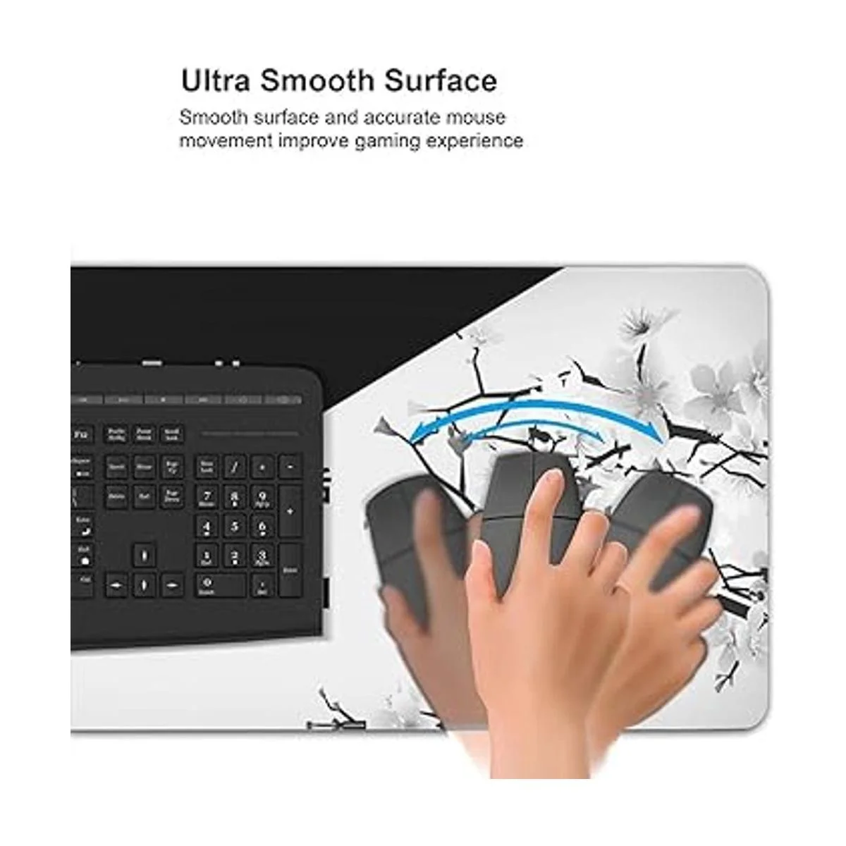 CDEB Alfombrilla de mouse para juegos con diseño de flor de cerezo en blanco y negro, XL, con bordes cosidos extendidos, alfombrilla de escritorio grande, base de goma antideslizante larga 31.5 x 11.8 pulgadas