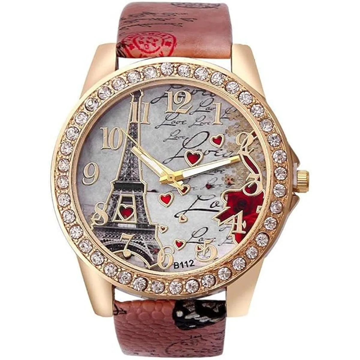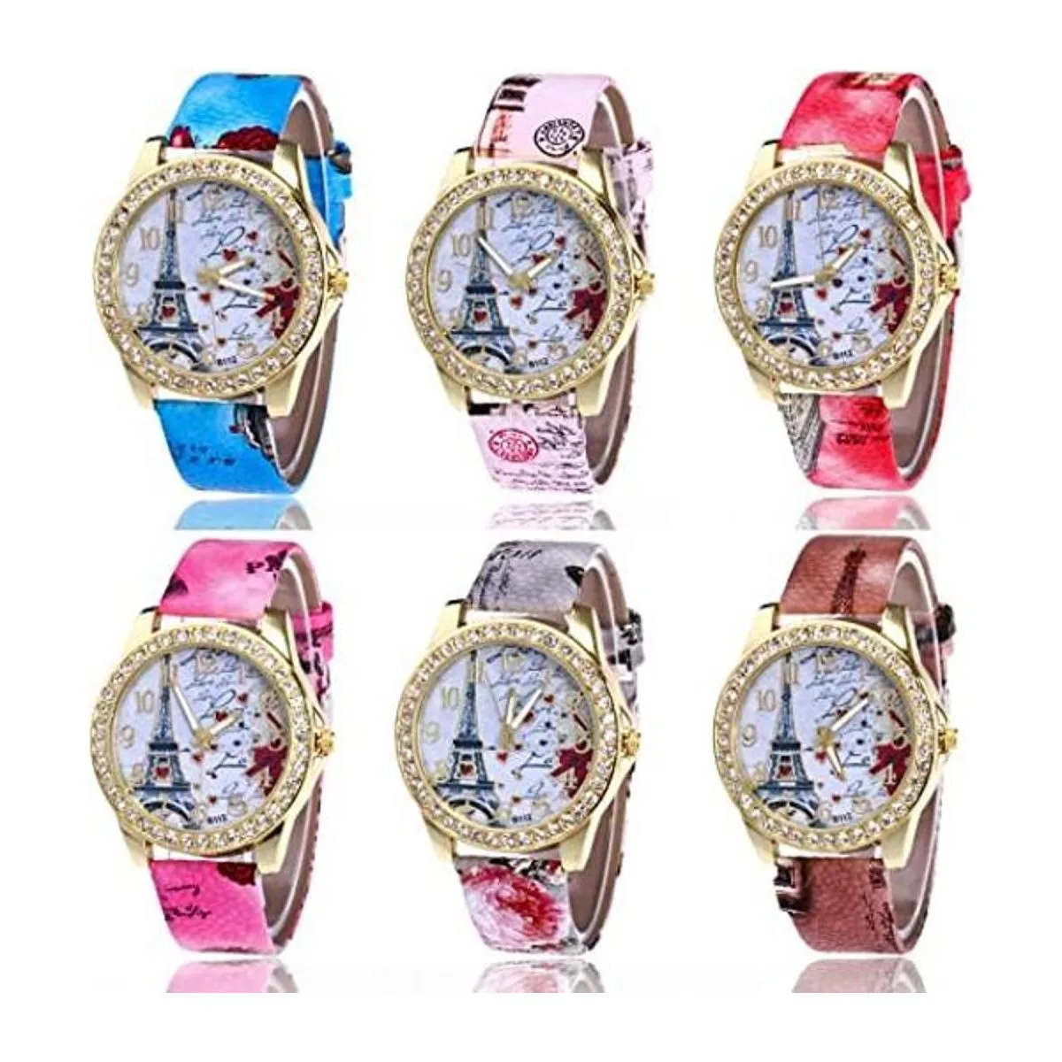 CdyBox Reloj de pulsera de cuero de la PU al por mayor 6 unidades de regalo del día de la madre Bling Rhinestone acentuado Torre Eiffel flor señoras mujeres relojes