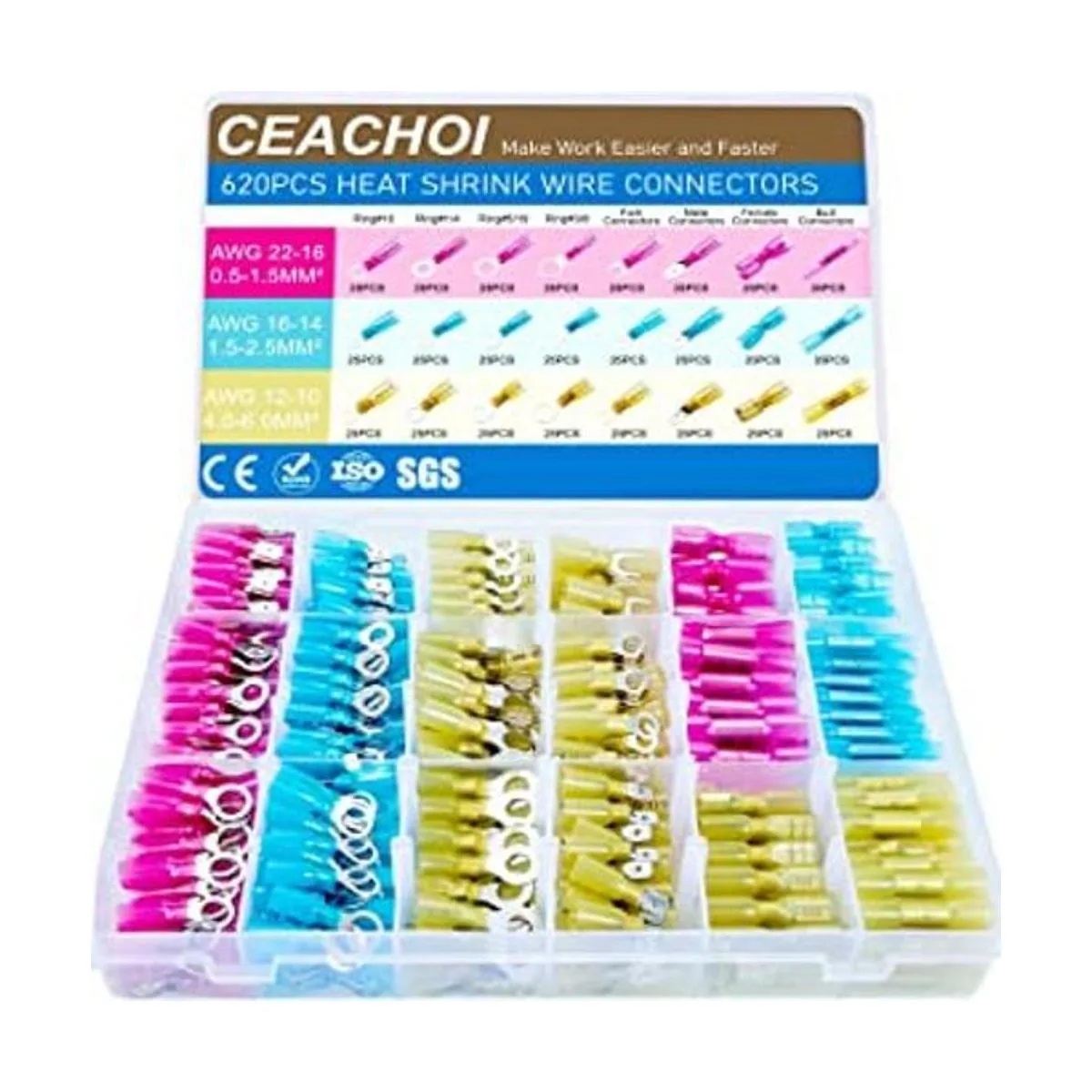 CEACHOI Kit de conectores de cable termorretráctiles de 620 piezas, kit de conectores de cables, terminales impermeables de grado marino, conectores a tope, anillos de horquilla de pala