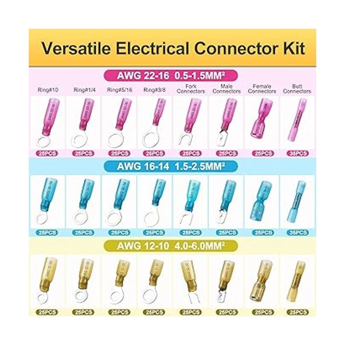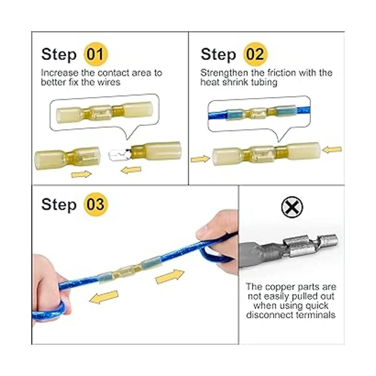 Amplia aplicación: conectores de cable termorretráctiles ampliamente utilizados en múltiples proyectos utilizados en iluminación de vehículos o ATV, estéreo de motocicleta, equipo electrónico de barco e interruptor de equipo. Cuando utilices nuestros conectores de cable termorretráctiles, cualquier pregunta, ponte en contacto con nuestro vendedor en cualquier momento. Garantizamos proporcionarte una solución satisfactoria