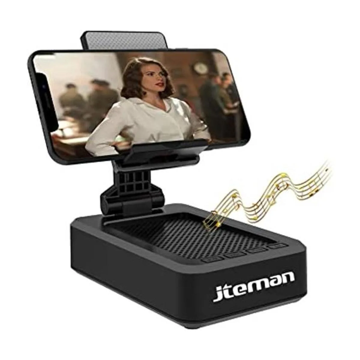 Wireless Bluetooth SpeakerThis cell phone stand with portable Bluetooth speaker delivers stunning sound with enhanced bass, tight mids, and crystal clear highs without distortion at any volume. Moreover, the speaker comes with a builtin microphone.