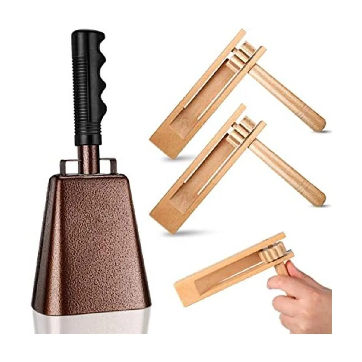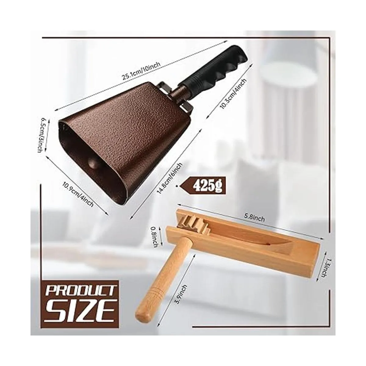 Cencerro de acero de 10.0 in con asa, para hacer ruido, animar a un instrumento musical de percusión y 2 piezas de madera giratoria, juguete tradicional de matraca para juegos, eventos deportivos, bodas, granja