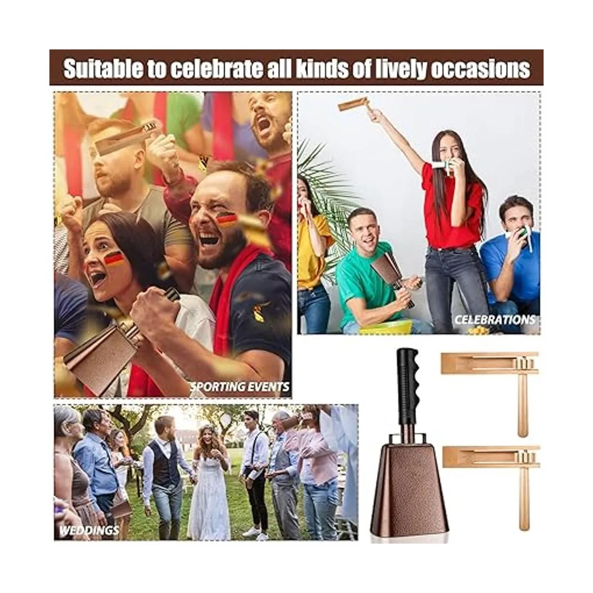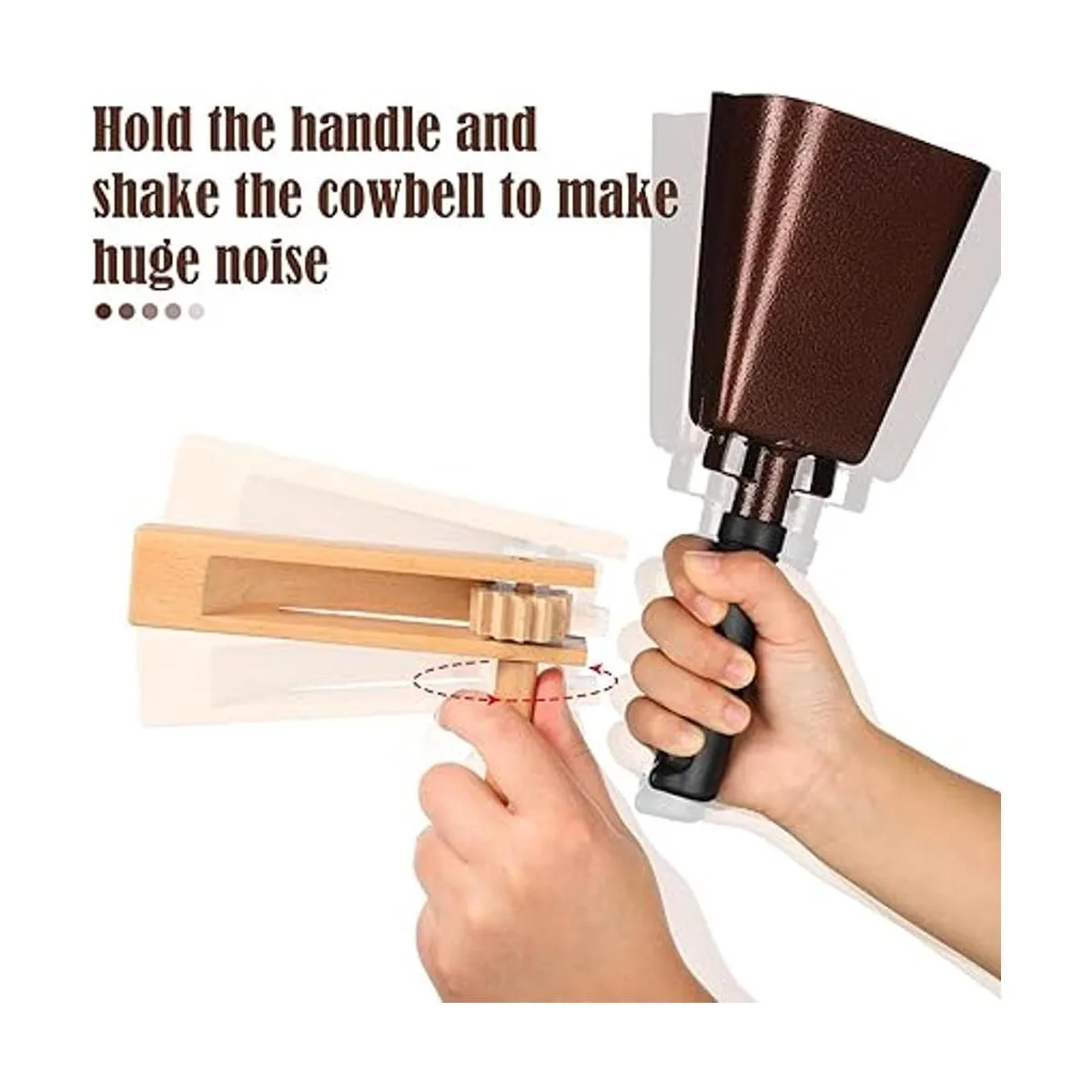 Sonido fuerte: el paquete incluye 1 campana de vaca y 2 trinquetes giratorios de madera, que pueden hacer un sonido muy alto en el entorno ruidoso, son adecuados para animar en eventos deportivos y otras actividades bulliciosas