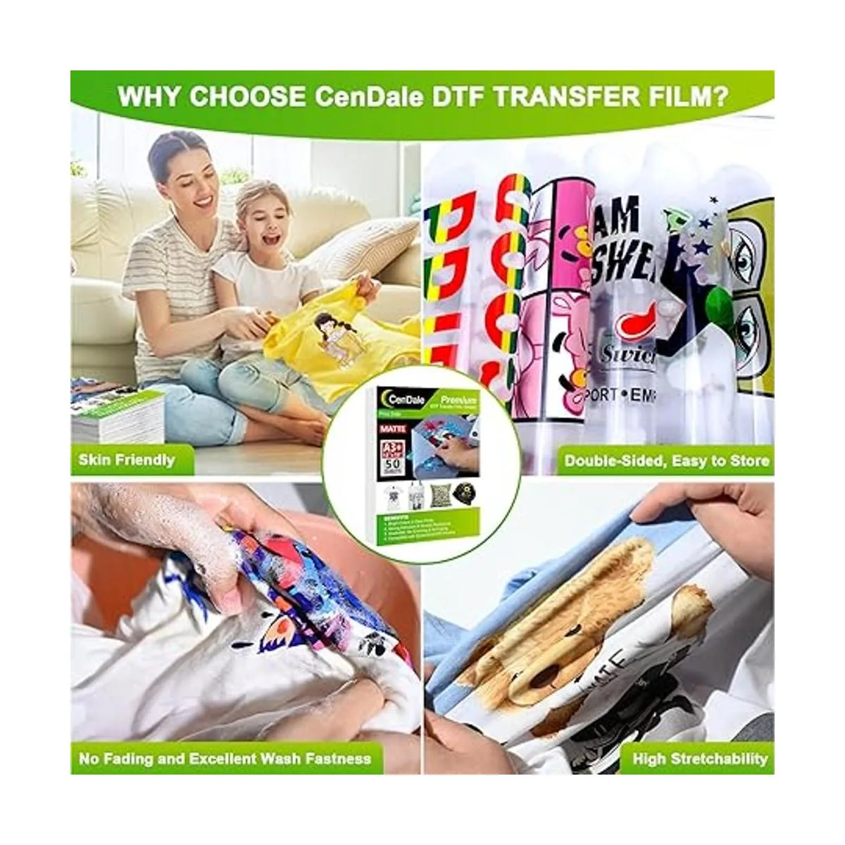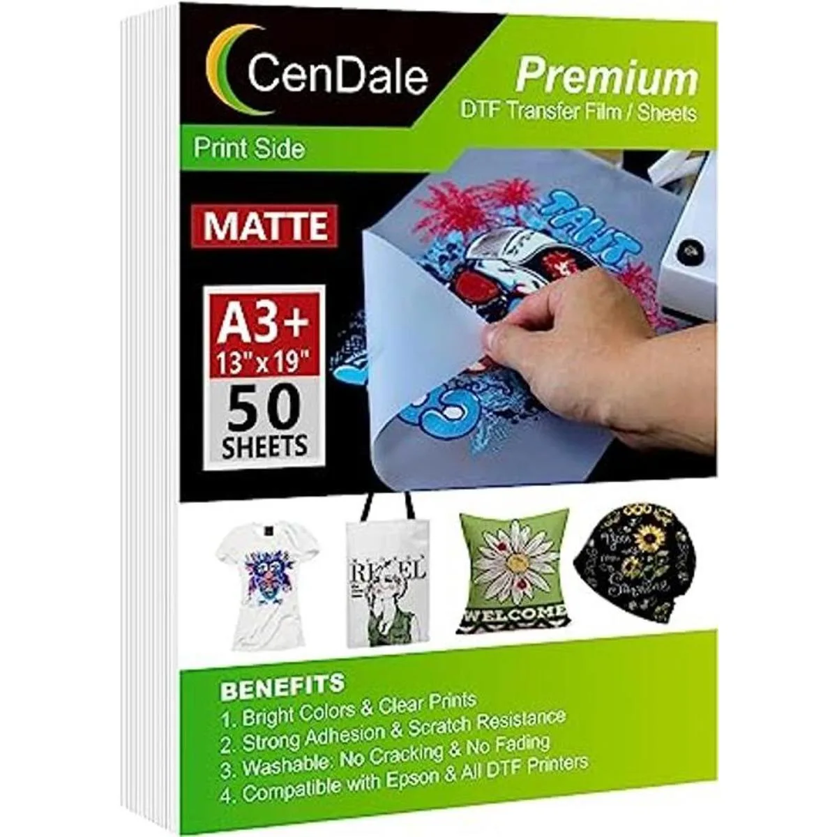 CenDale A3 Plus Película de transferencia DTF de alta calidad de 13 x 19 pulgadas, 50 hojas de doble cara transparente mate pretratamiento, papel de transferencia de calor PET para impresión directa en todas las telas y colores, camisetas textiles