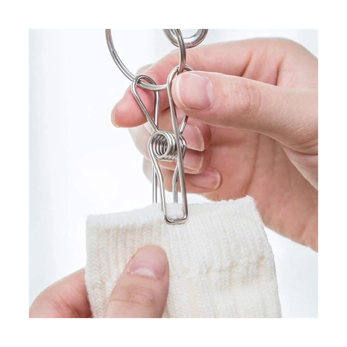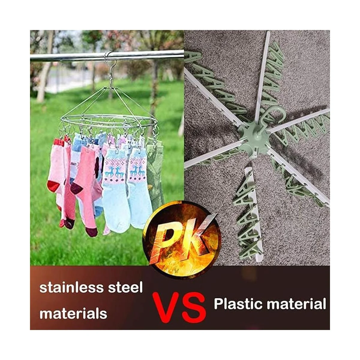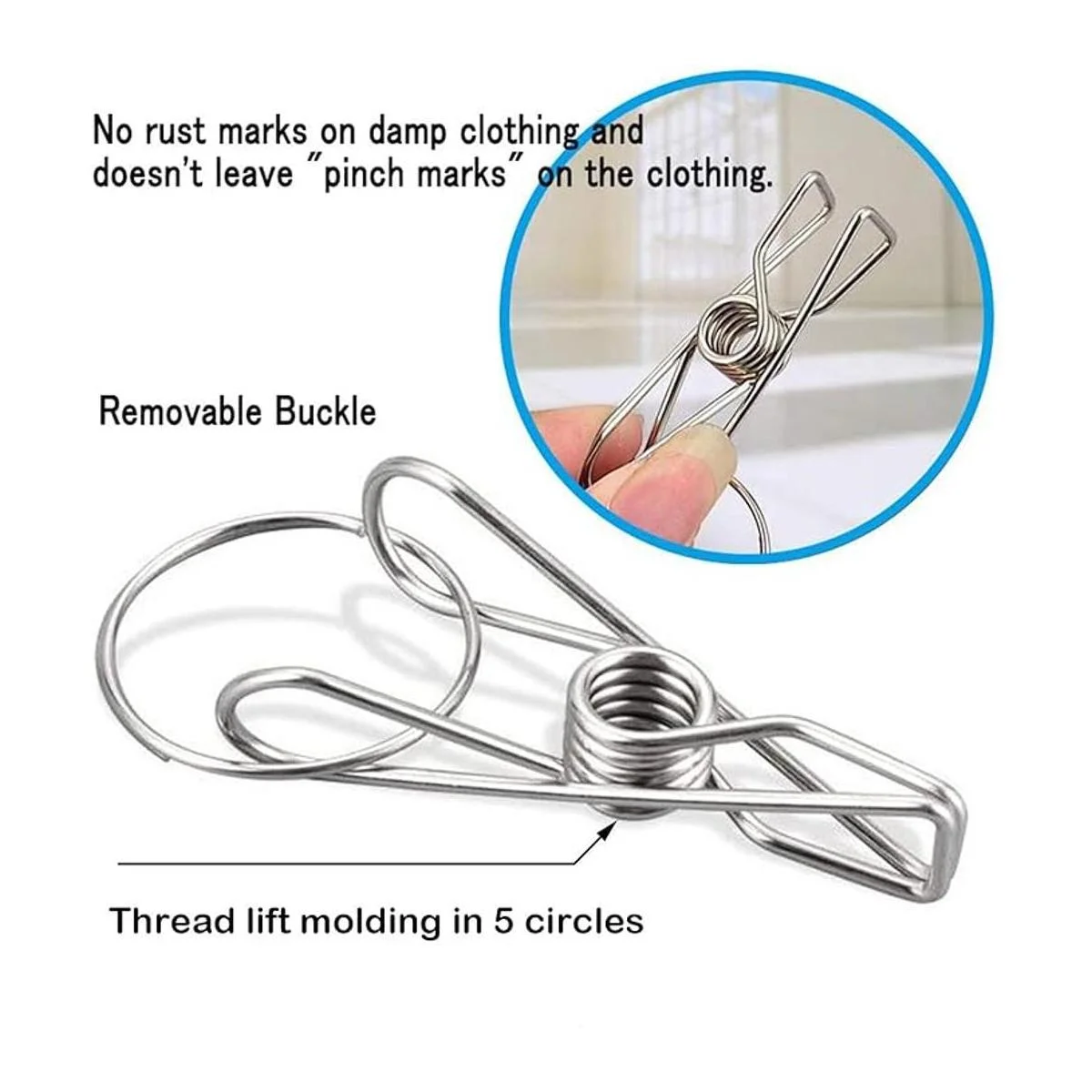 Resistente al viento y 20 clips Las perchas de goteo tienen una hebilla resistente al viento para asegurar que la percha no sea soplada por el viento. Está equipado con 20 clips de acero inoxidable de una sola pieza que se pueden utilizar para colgar muchos objetos pequeños.