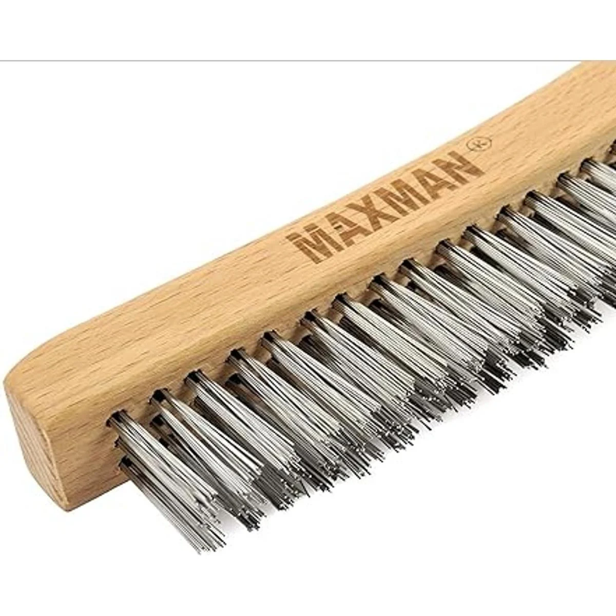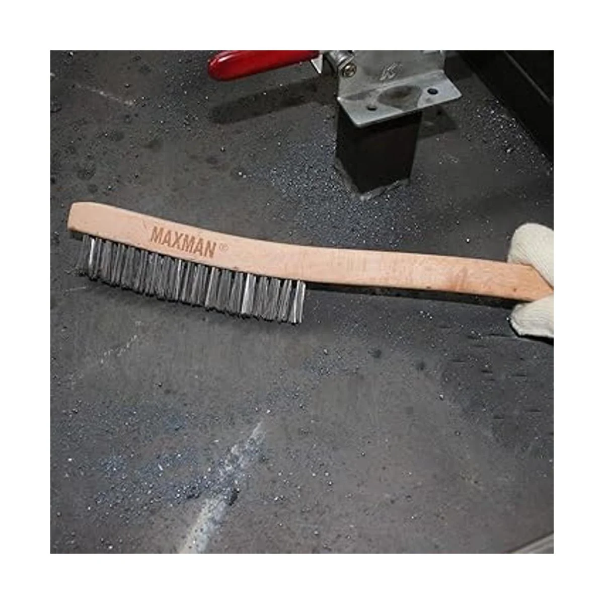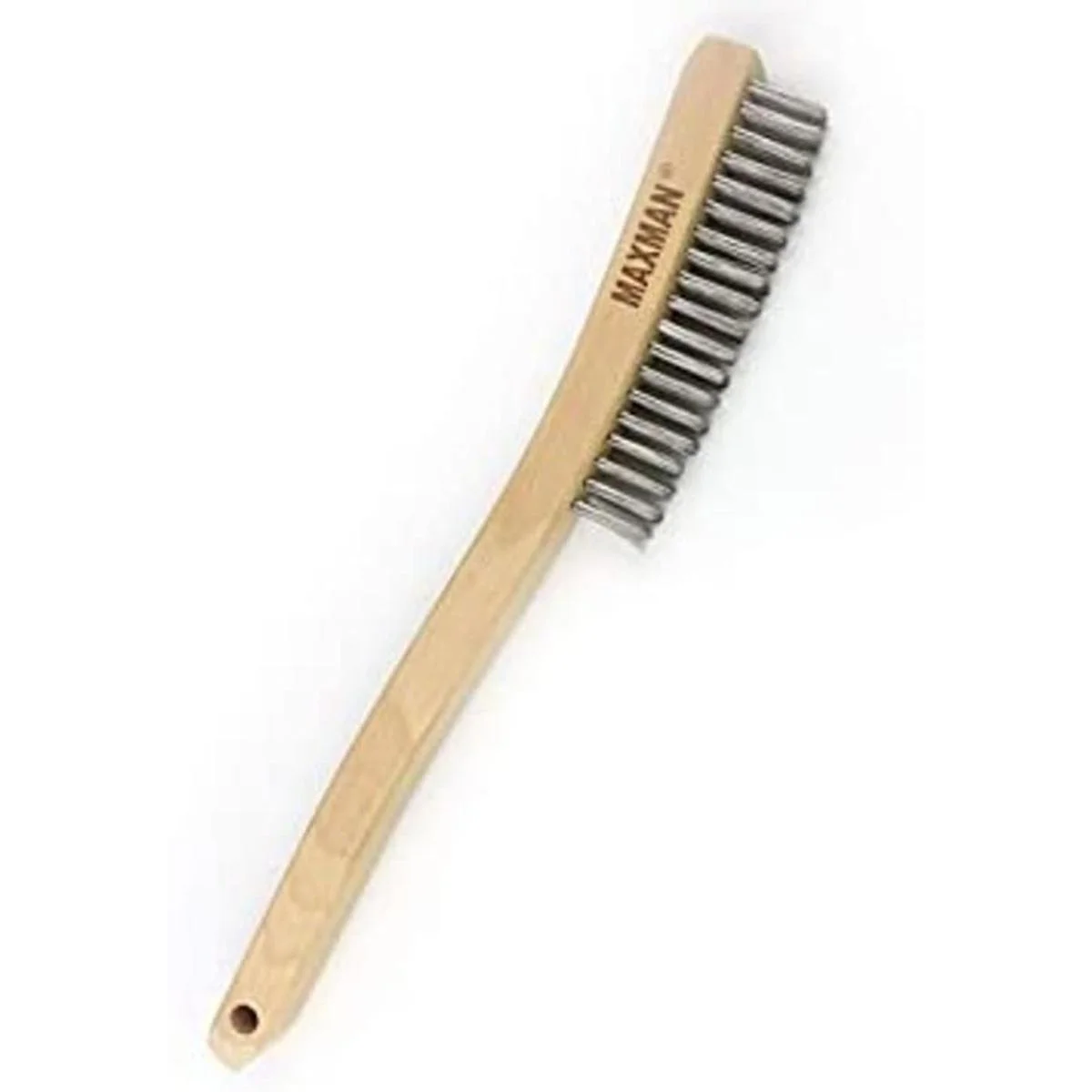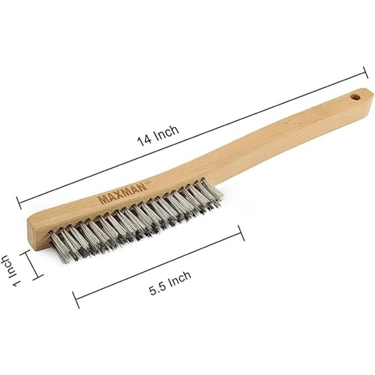 Cepillo de alambre, cepillo de alambre de acero inoxidable para limpiar el óxido con mango curvado de madera de haya de 14 pulgadas de largo, grande