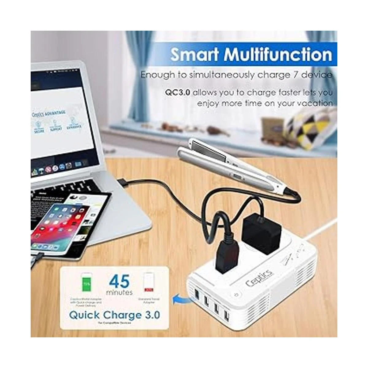 Carga 6 dispositivos a la vez: 2 entradas de Estados Unidos, 4 USB con QC 3.0 carga más rápida, perfecto para CPAP, cepillo de dientes eléctrico, ventilador, nebulizador, consola de juegos, puerto que permite carga simultánea multidispositivo a alta velocidad. La tecnología Ceptics puede producir 6.4 A máx. y coincide automáticamente con la corriente máxima de carga de los dispositivos conectados. Certificado de seguridad: ventilador silencioso para evitar que se sobrecaliente, protección contra sobretensiones, sobrecorriente, sobretemperatura, protección contra cortocircuitos.