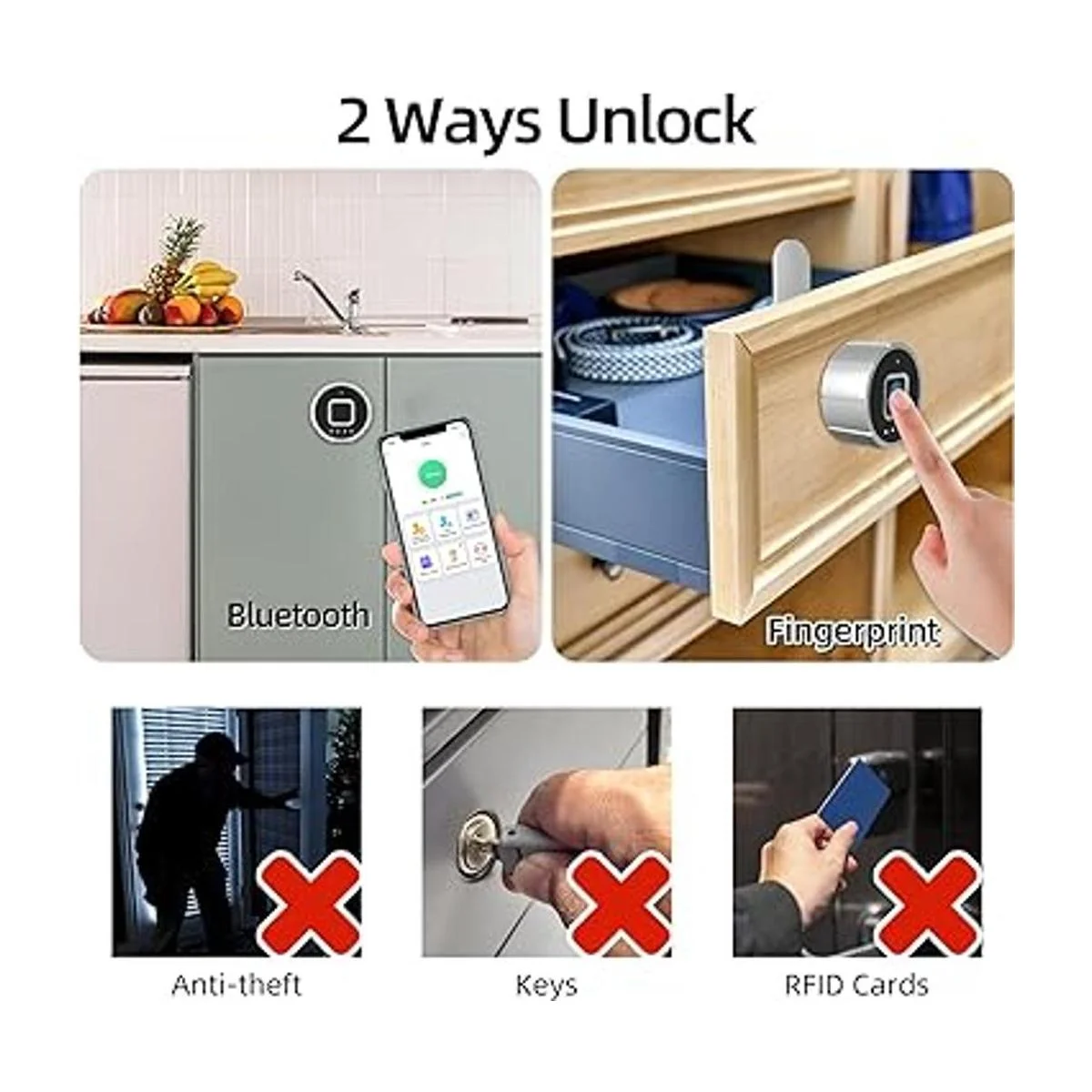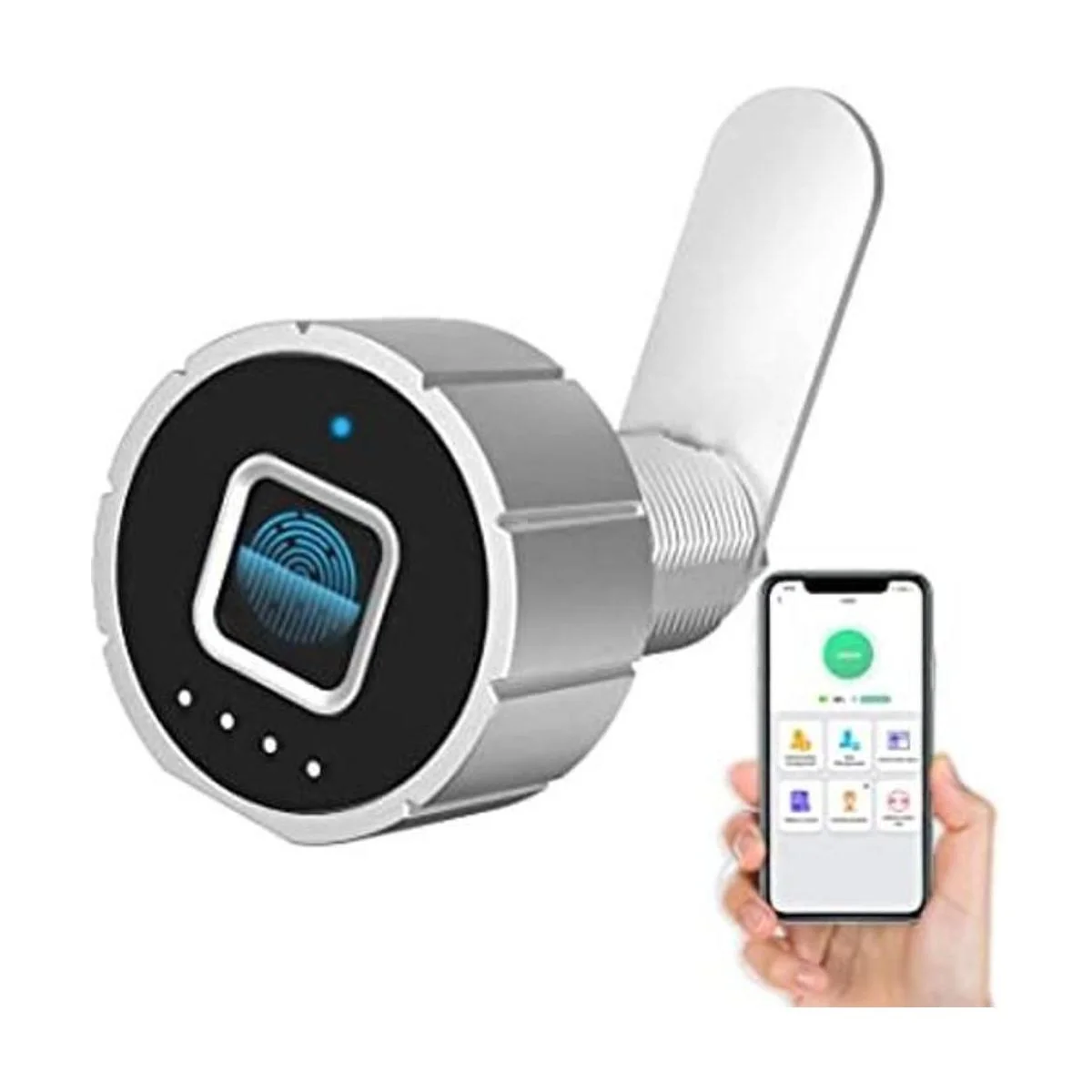 Bloqueo de huellas dactilares: tecnología avanzada de bloqueo de huellas dactilares con mejor respuesta y sensibilidad. Desbloqueo rápido en 0,5 segundos, gran capacidad de 15 huellas dactilares, fácil de usar. El bloqueo de huellas dactilares soporta 15 huellas dactilares. Utiliza tu huella digital para desbloquear, manténgase alejado de llaves, Bluetooth, etc.