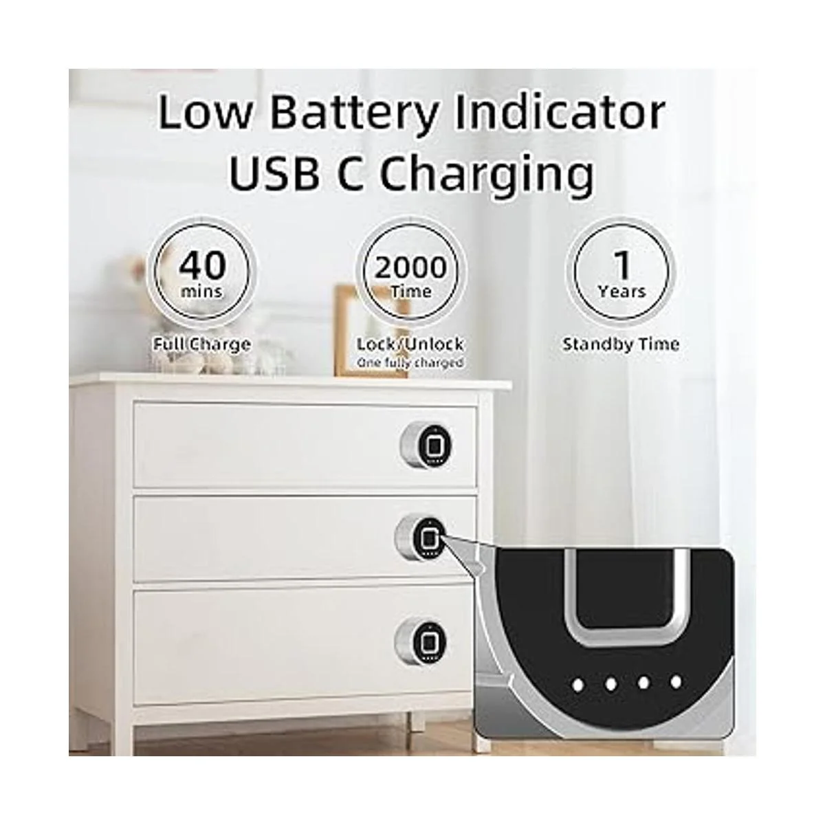 3 cierres diferentes: cambia los cierres de acuerdo a tus necesidades, el bloqueo de huellas dactilares con cierres de 3 tamaños. Fácil de instalar en pocos pasos, adecuado para cajones individuales con un grosor inferior a 0.787 in.