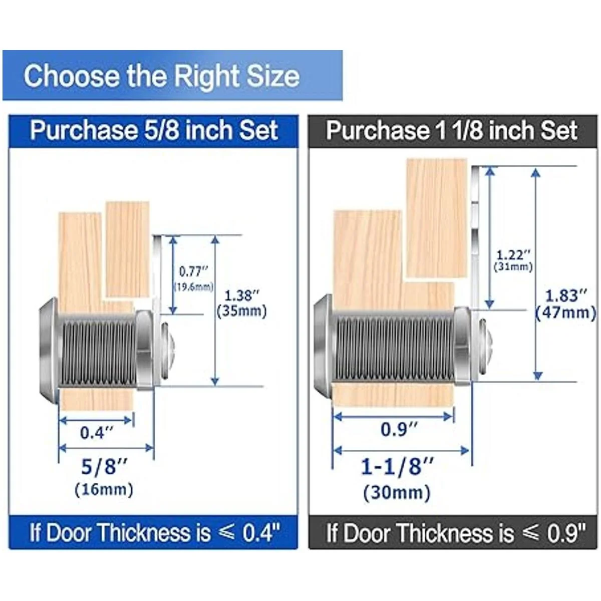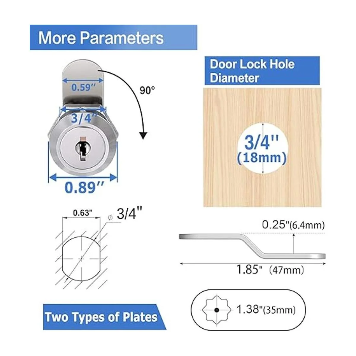 : comprueba los tamaños para asegurarte de elegir el bloqueo de leva correcto. La longitud del cuerpo de la cerradura principal es de 0.630 in, se adapta a paneles de puerta de menos de 0.394 in de grosor, y el diámetro del agujero de montaje es de 0.728 in. La longitud de dos placas una compensación y una recta es de 1.850 in y 1.378 in, ver diagrama para una imagen más detallada. El juego de 12 paquetes de cerraduras con llave incluye 12 paquetes de cerraduras de 0.630 in, 24 placas de bloqueo y 24 llaves.