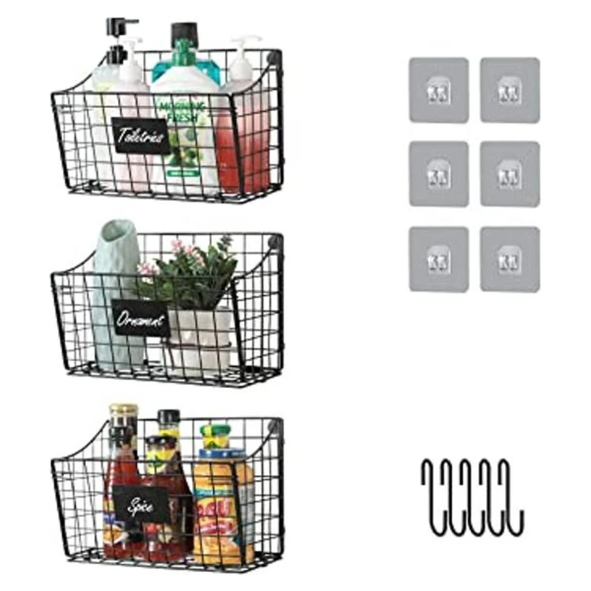 Cesta de almacenamiento para colgar en la pared con 5 ganchos, 3 placas de etiquetas, paquete de 3 unidades, cesta de alambre de metal para colgar, decoración rústica de granja, estante de organización para despensa, cocina, baño, 10.6 x 7.5 x 5.1 pulgadas