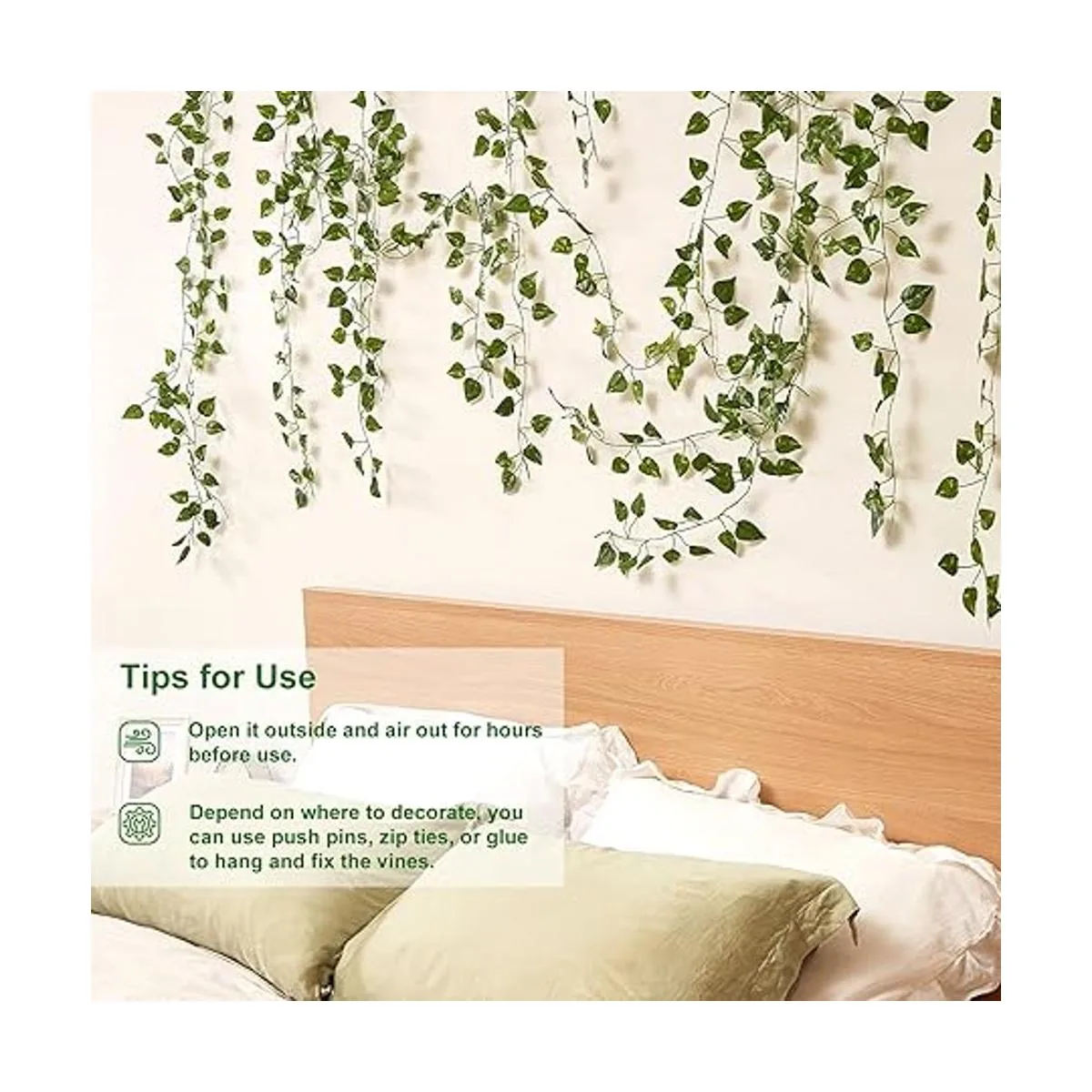 Usos de guirnaldas de hiedra: estas vides colgantes artificiales se pueden utilizar para telón de fondo de sofá, cambio de imagen de habitación, decoración colgante de ventana de dormitorio, sala de estar, decoración de pared, suministros de fiesta temática de selva, decoración de dormitorio de dinosaurio, fondo de vegetación, enrejado de patio, arco al aire libre, tablero de boda, patio trasero, etc.
