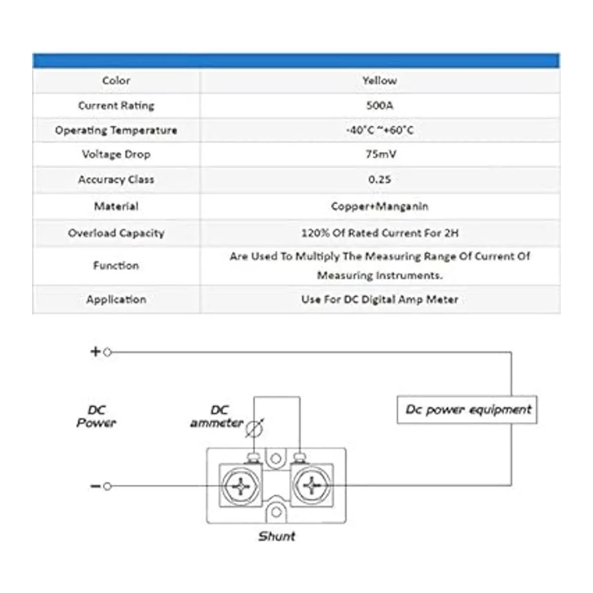 Parámetros: 500 A 75 mV DC. Caída de voltaje: 50 mV. Precisión: /0,25. Temperatura de funcionamiento: 40.0 F a 140.0 F. Material: cobre y manganina. Humedad relativa: menos o igual a 95 95.0 F.